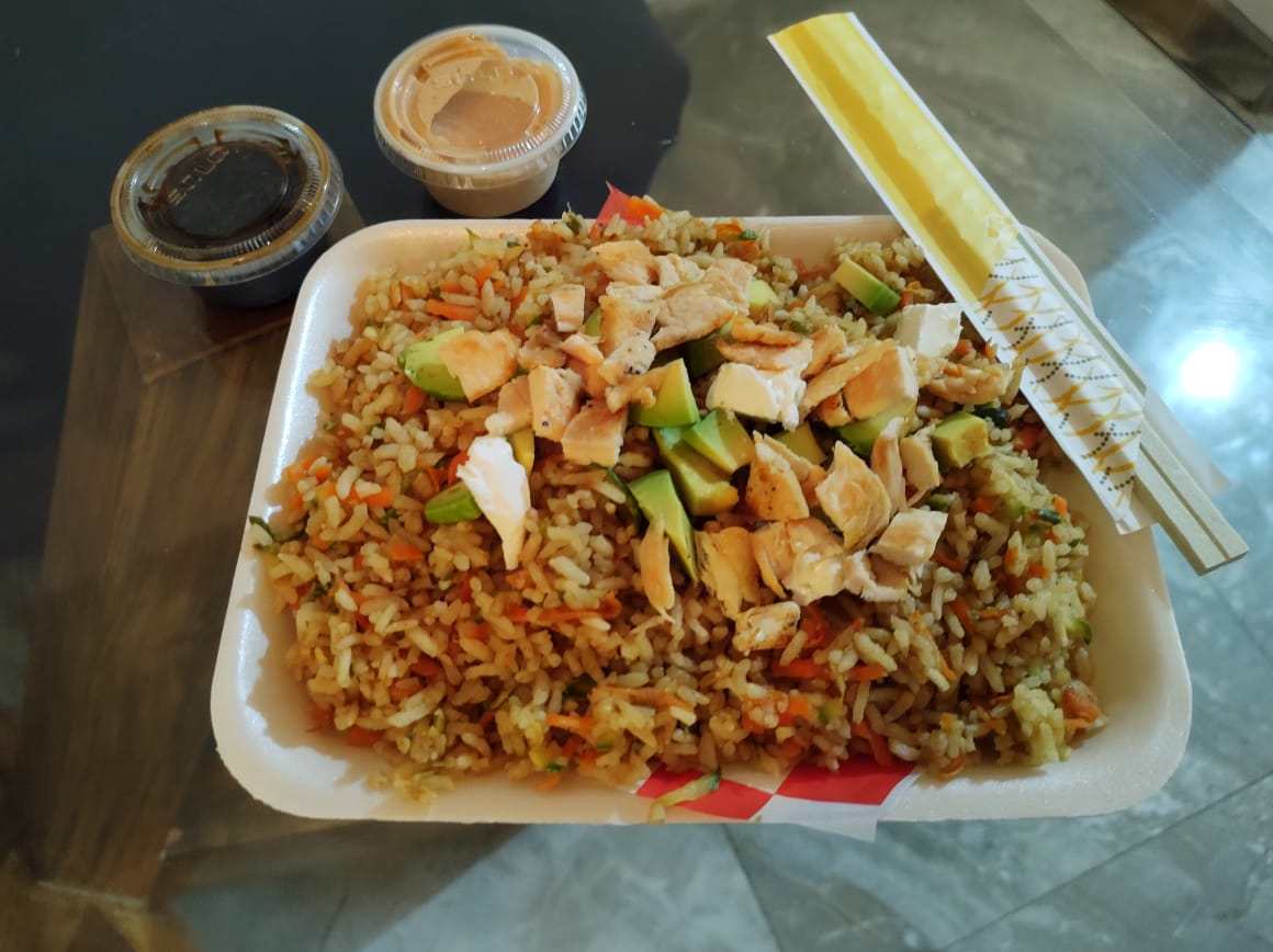 Arroz frito, zanahoria, calabaza, cebollín, acompañado con aguacate y philadelphia.
