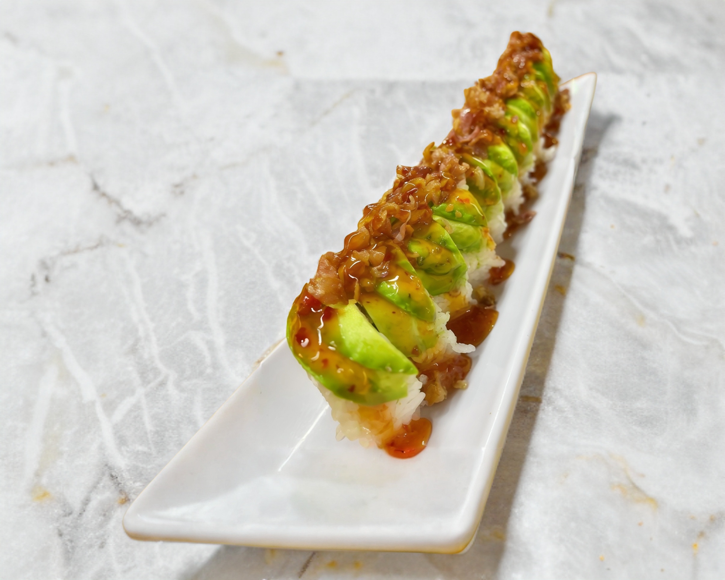 Rollo envuelto de aguacate relleno de queso crema pepino y pollo con topen de tocino y salsa agridulce