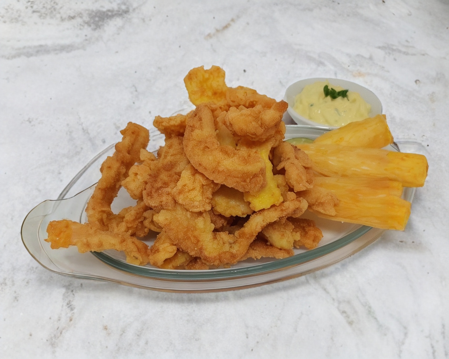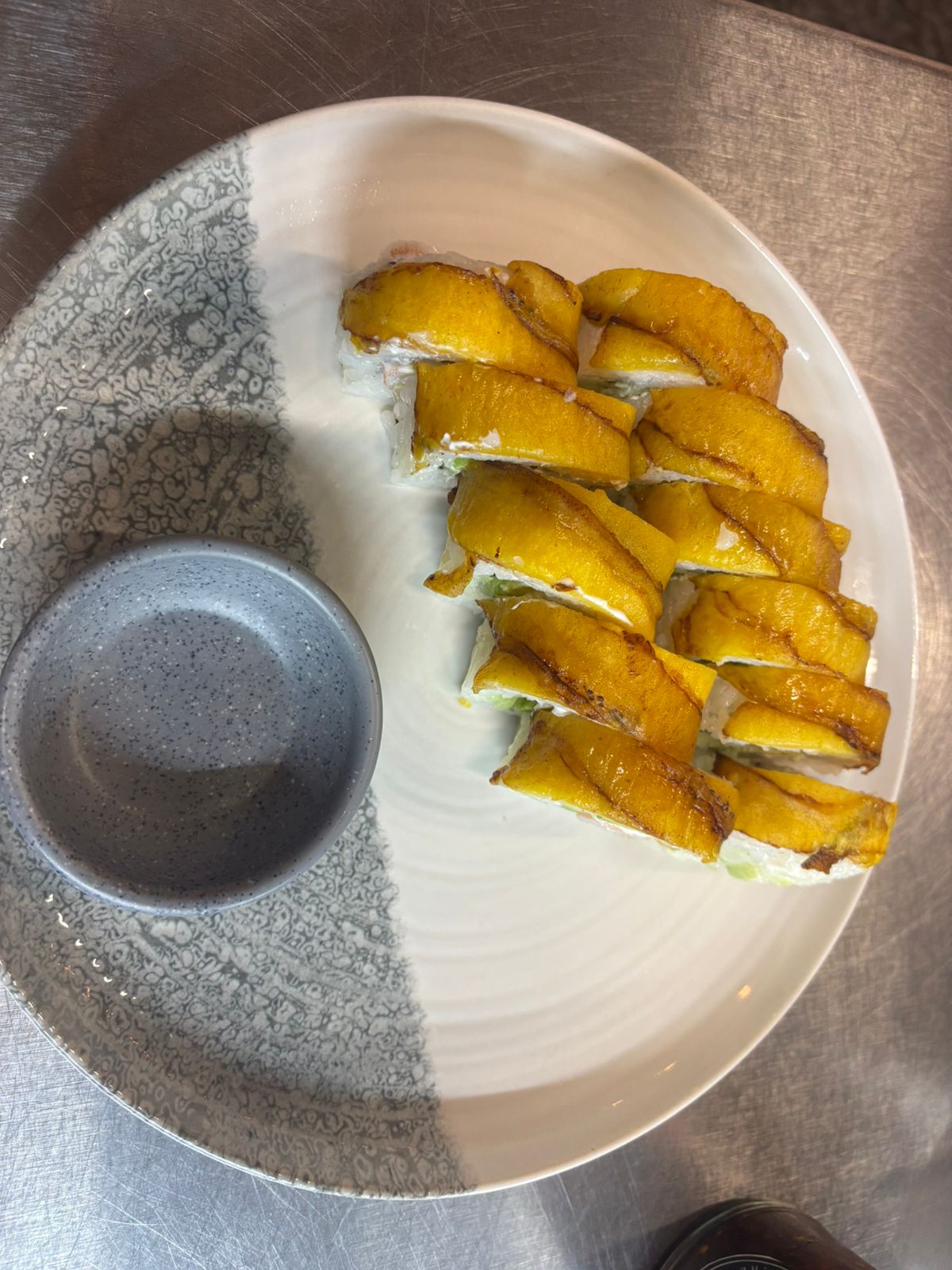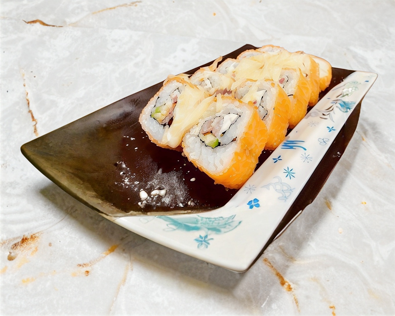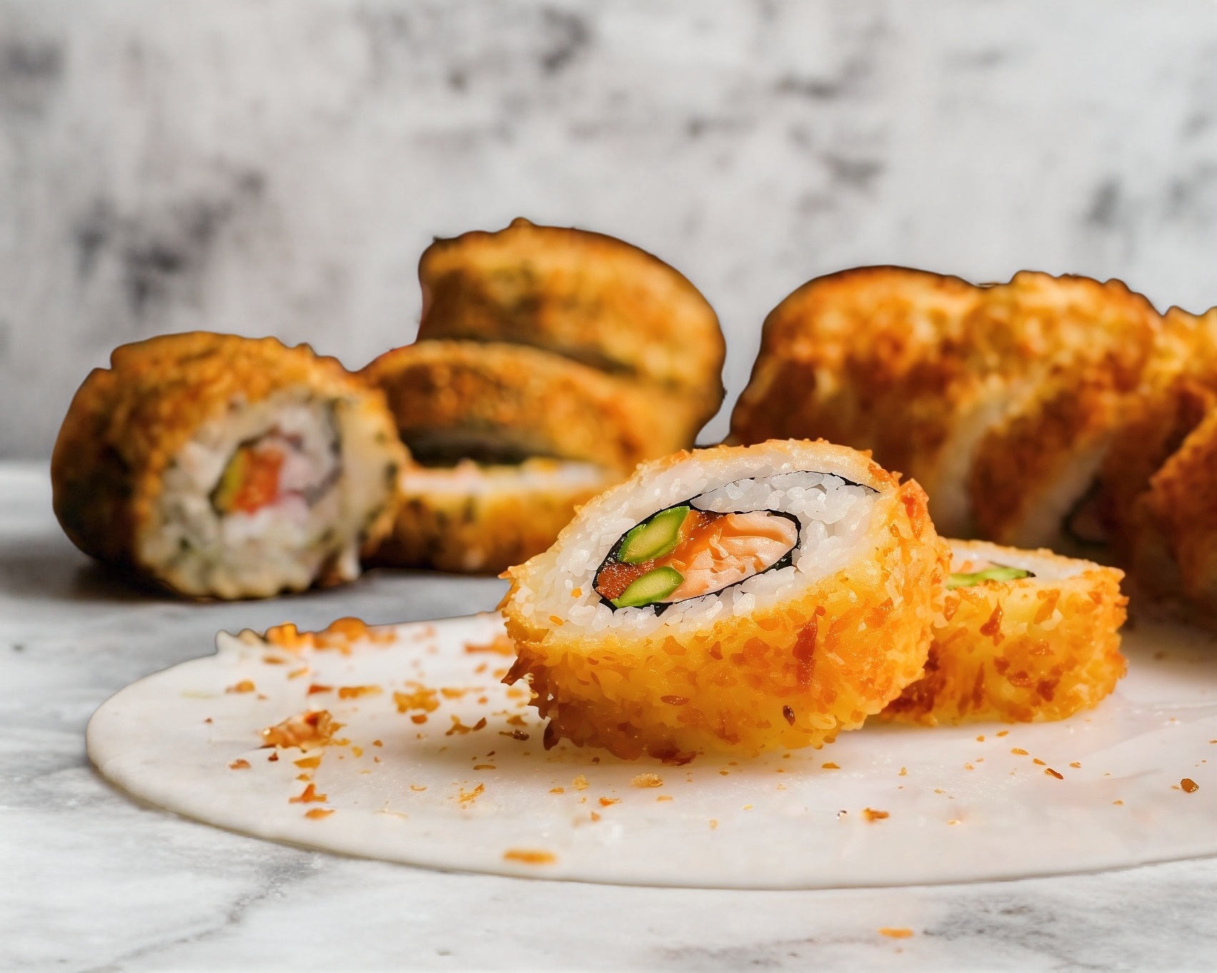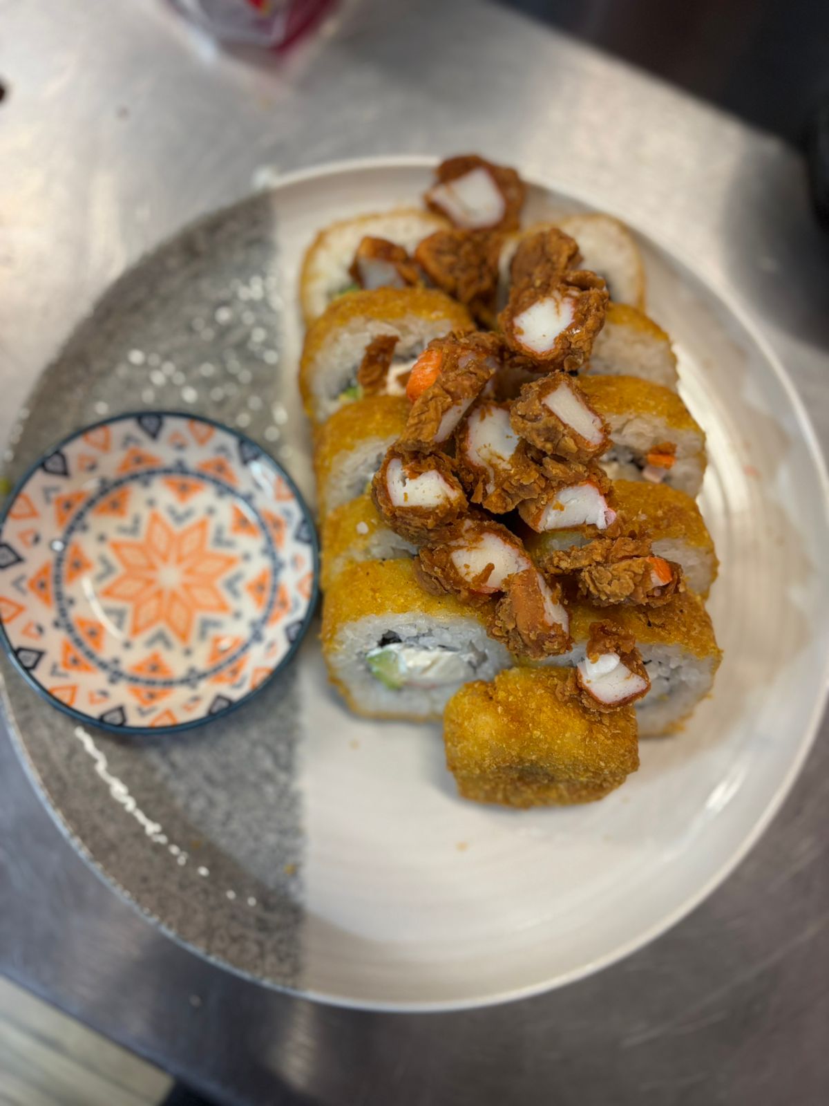 Rollo empanizado, relleno de aguacate, queso crema, surimi con topping de chicharrón de surimi y un toque de aderezos.