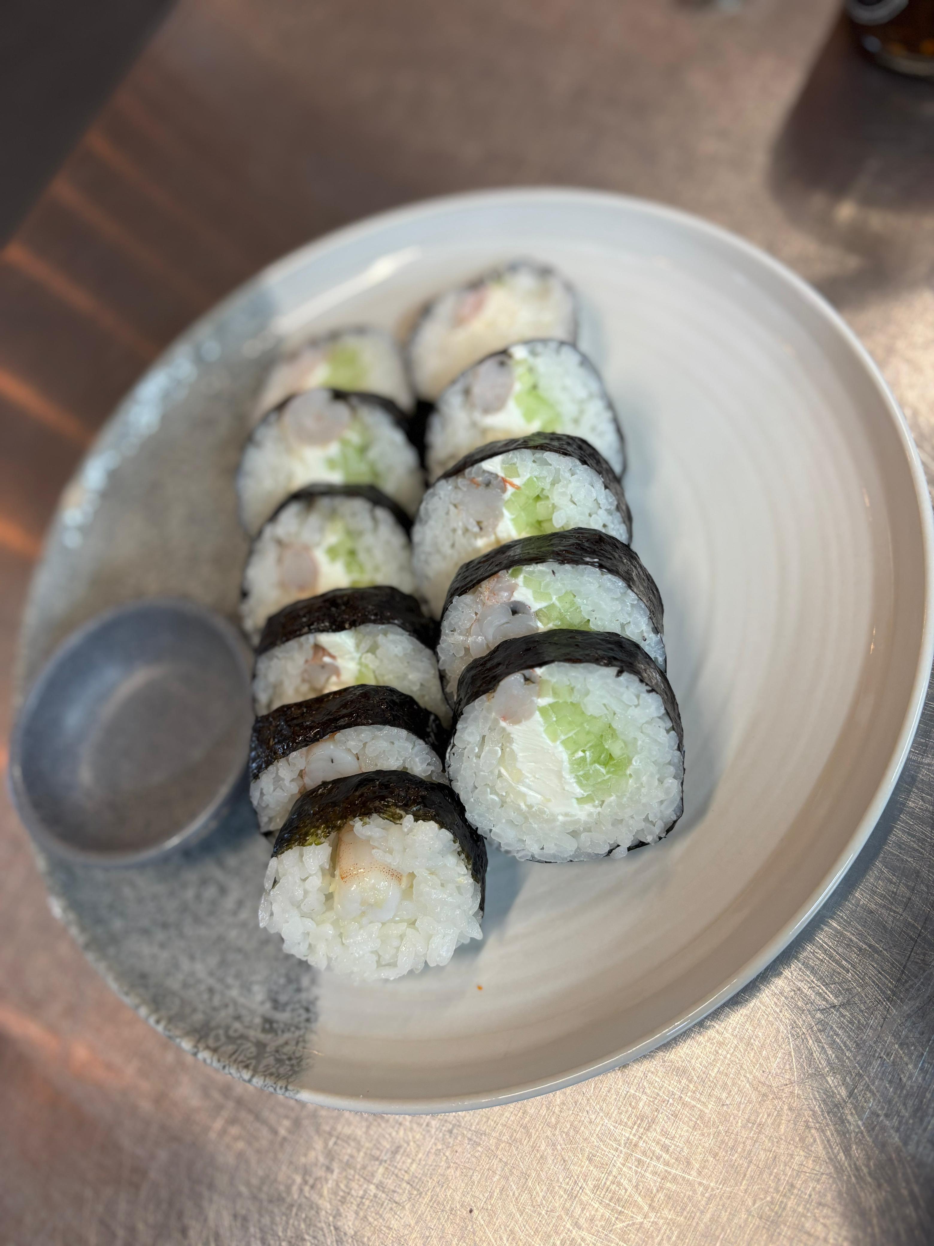 Rollo envuelto en camarón, relleno de pepino, aguacate y queso crema.