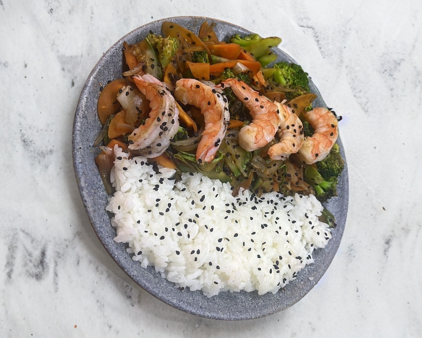 Verduras sazonadas a la plancha bañadas en salsa de soya con proteína de su elección.