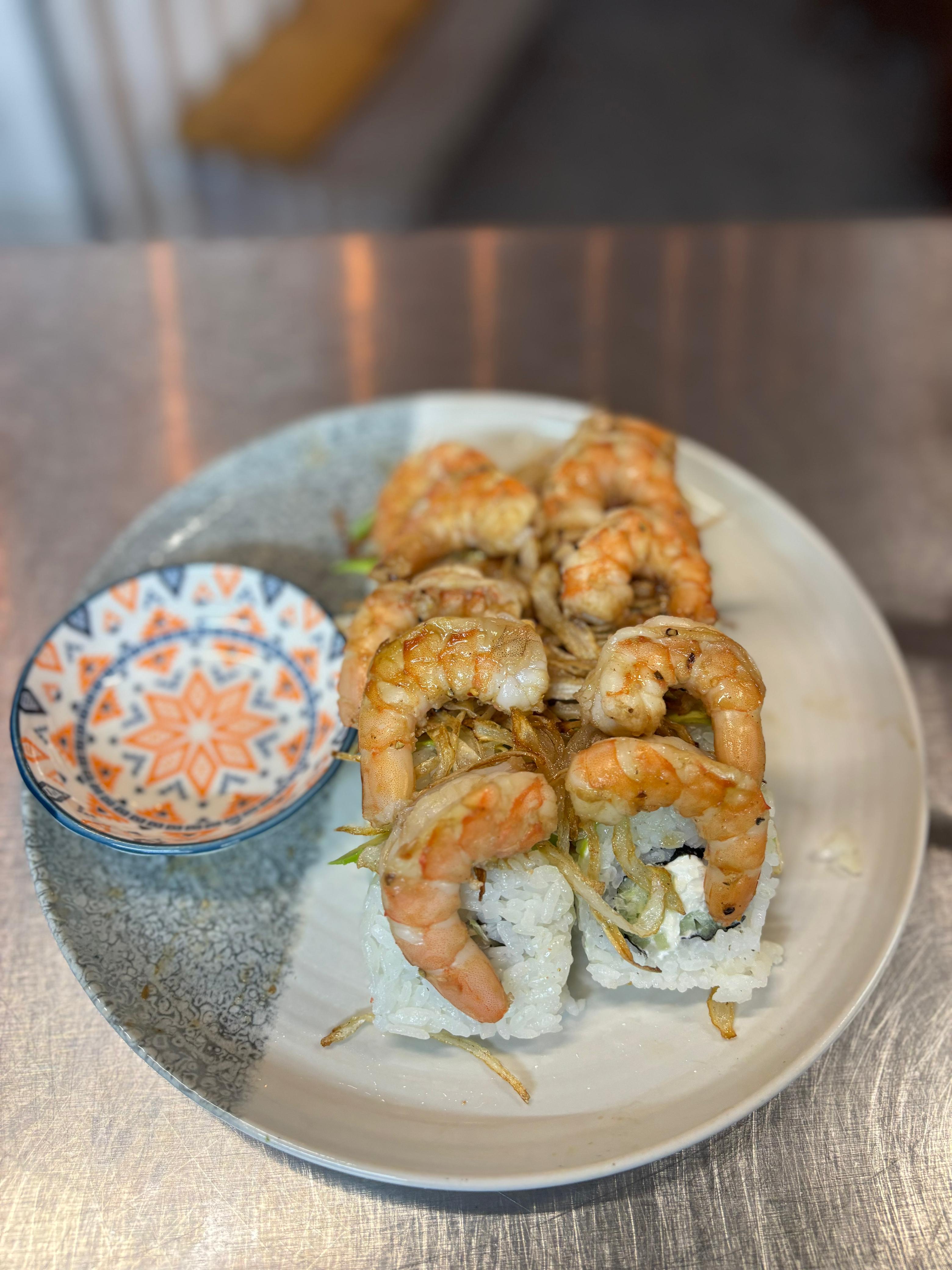 Rollo envuelto en aguacate relleno de queso crema y pepino con topin de camarones a la plancha y cebrolla frita