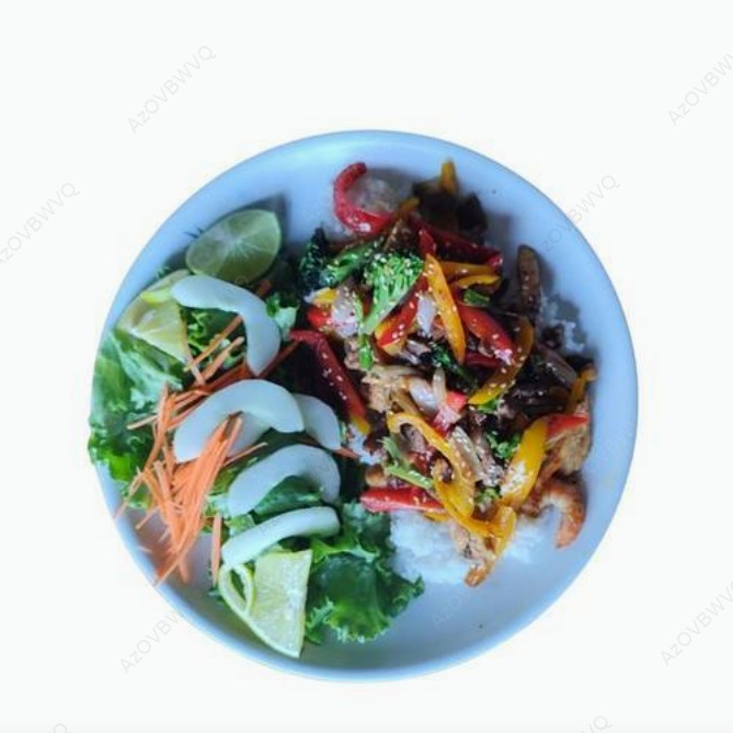 Delicioso arroz frito de pollo con verduras y sazonado de forma oriental, con Philadelphia y aguacate, ¡nuestra especialidad!