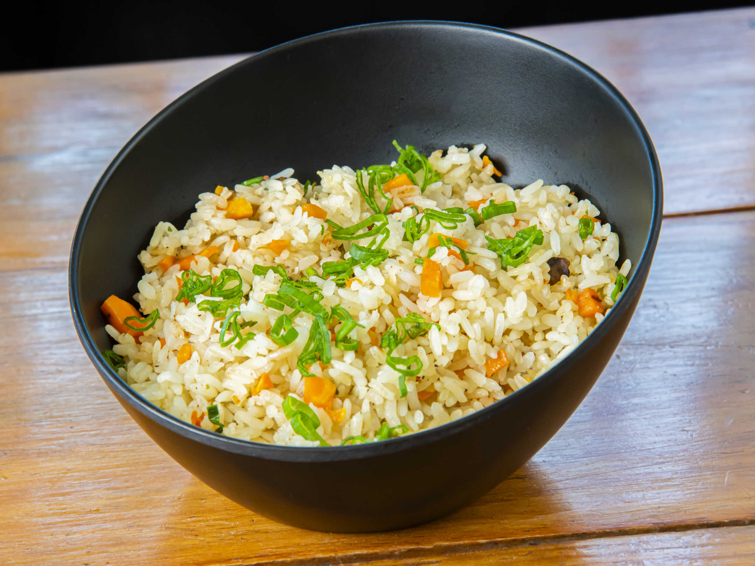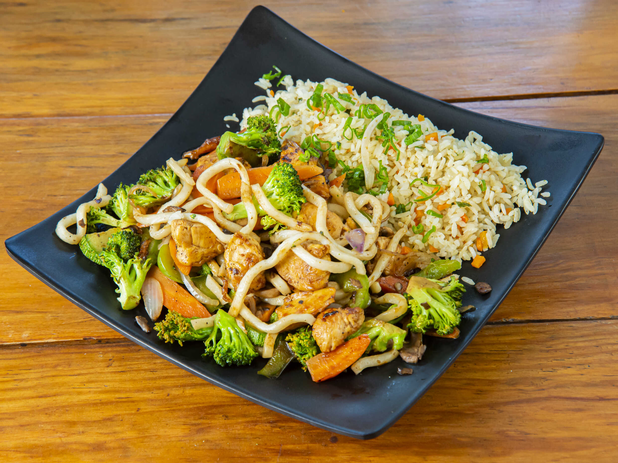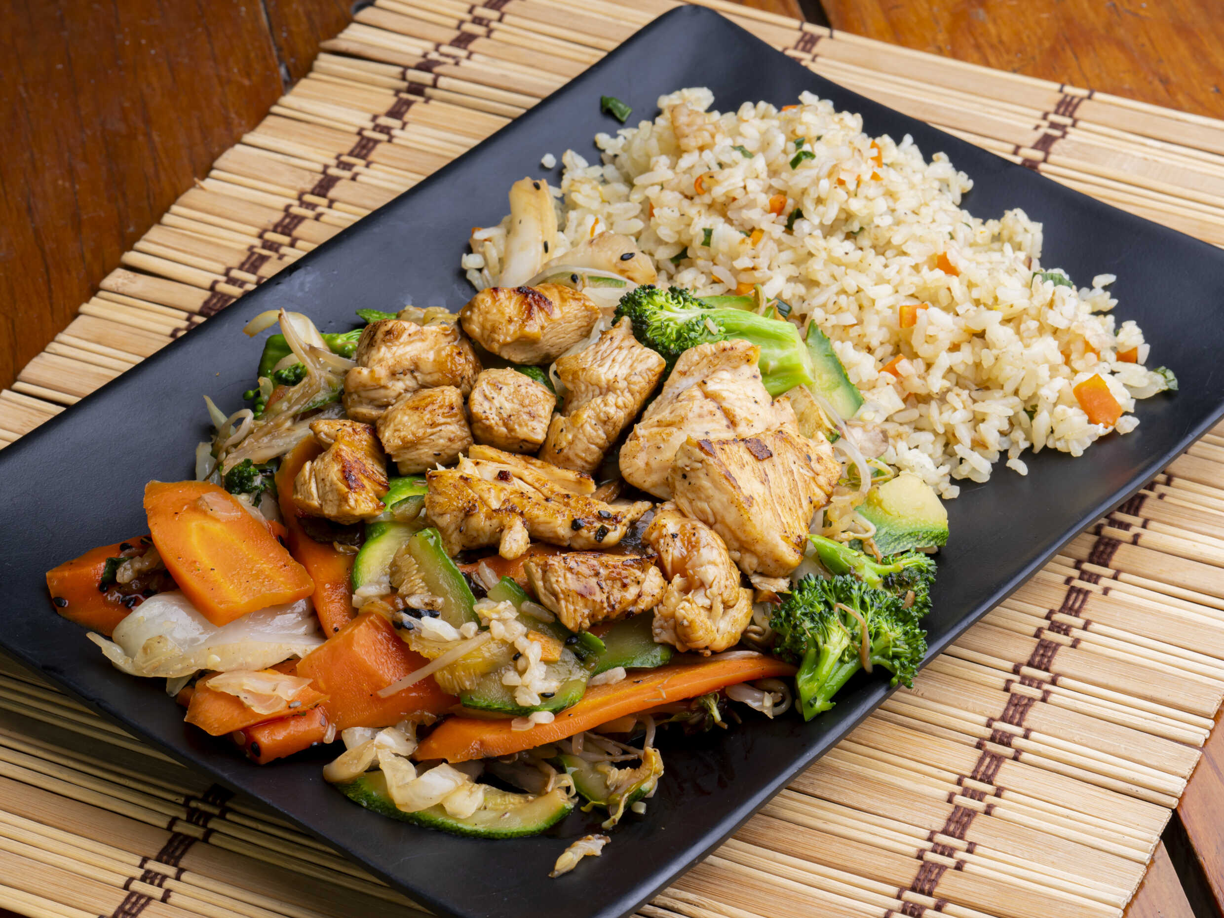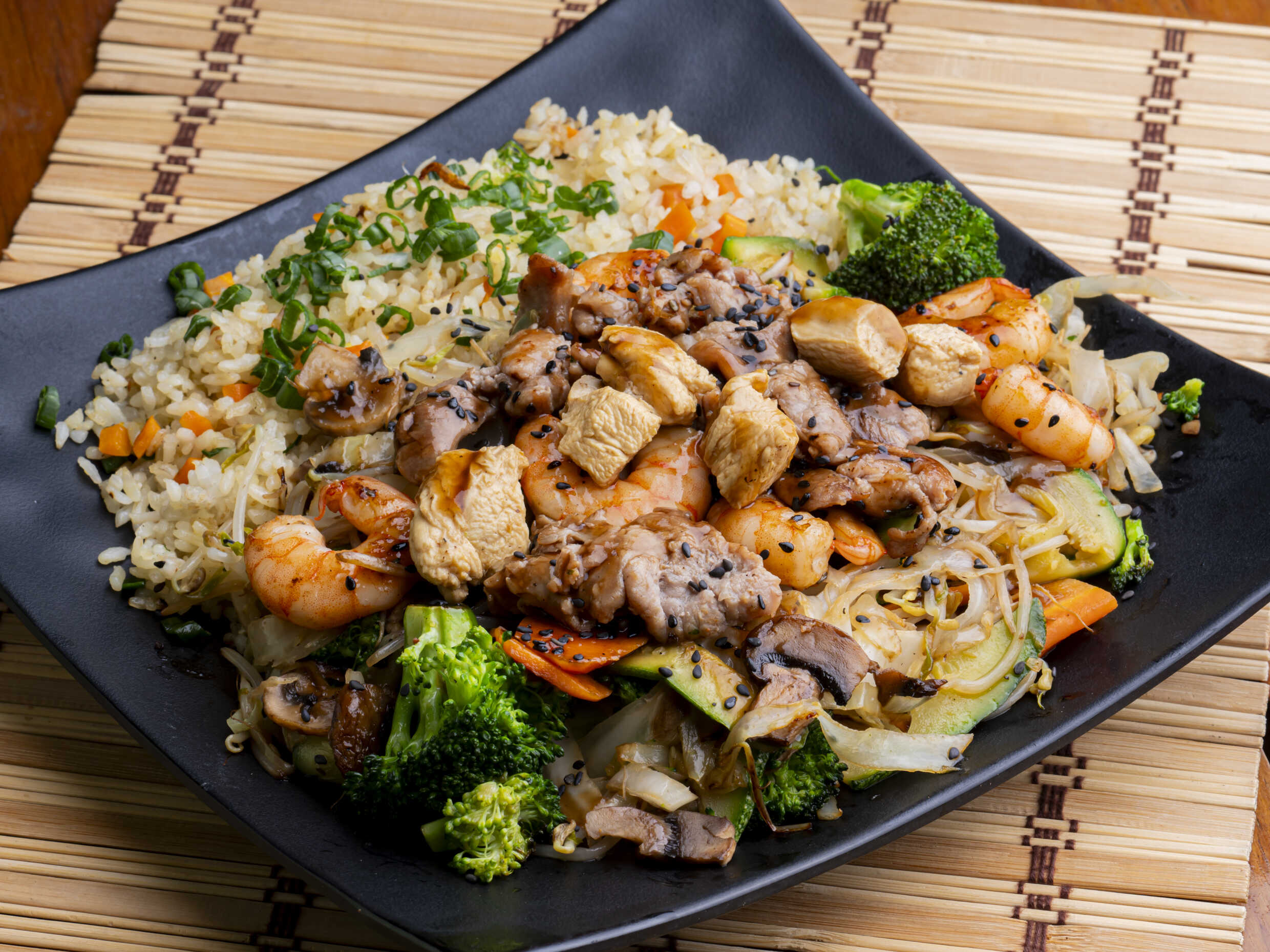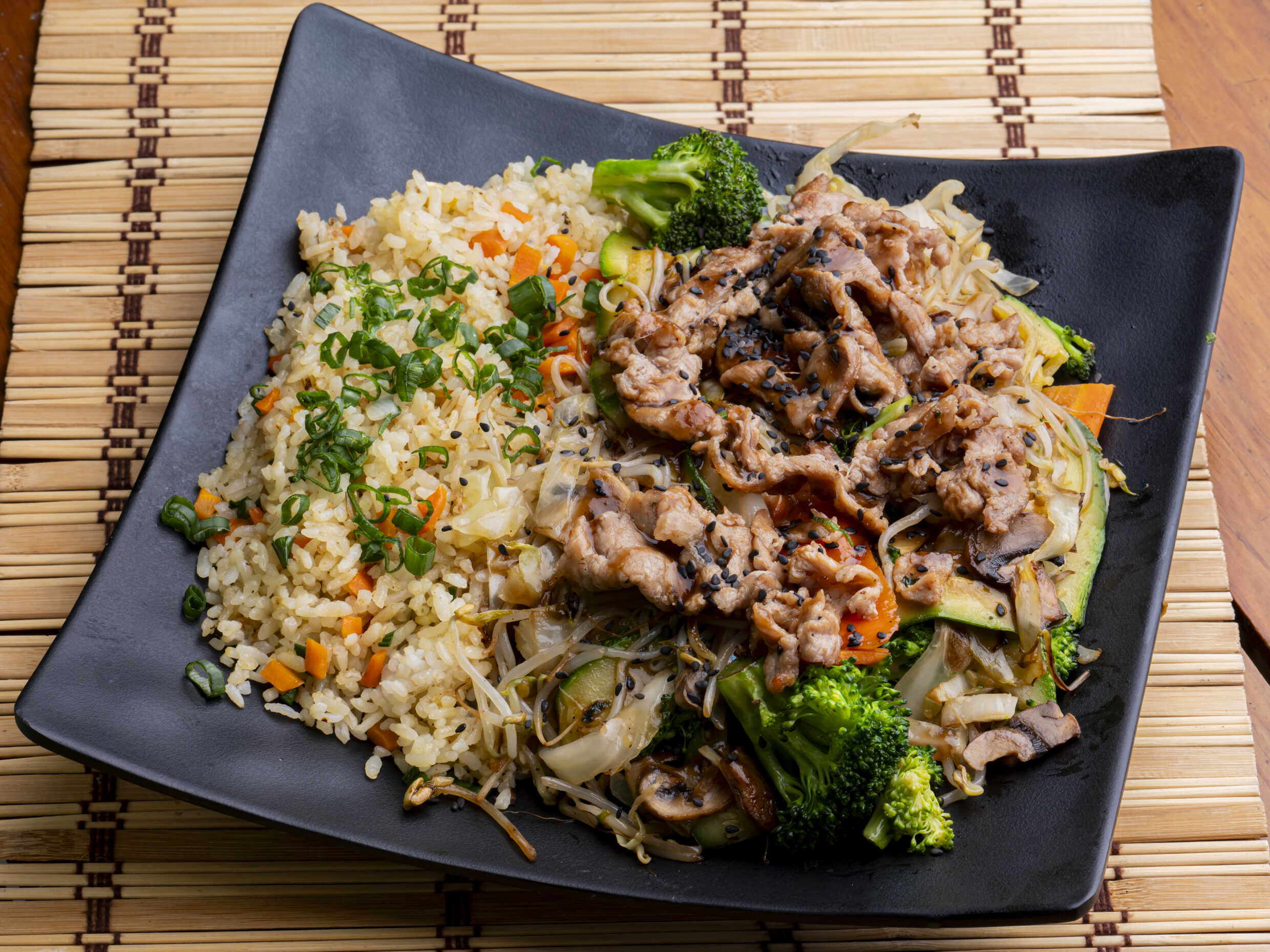 Teppanyaki, arroz frito, 2 brochetas de res y 1 rollo 3 quesos.
