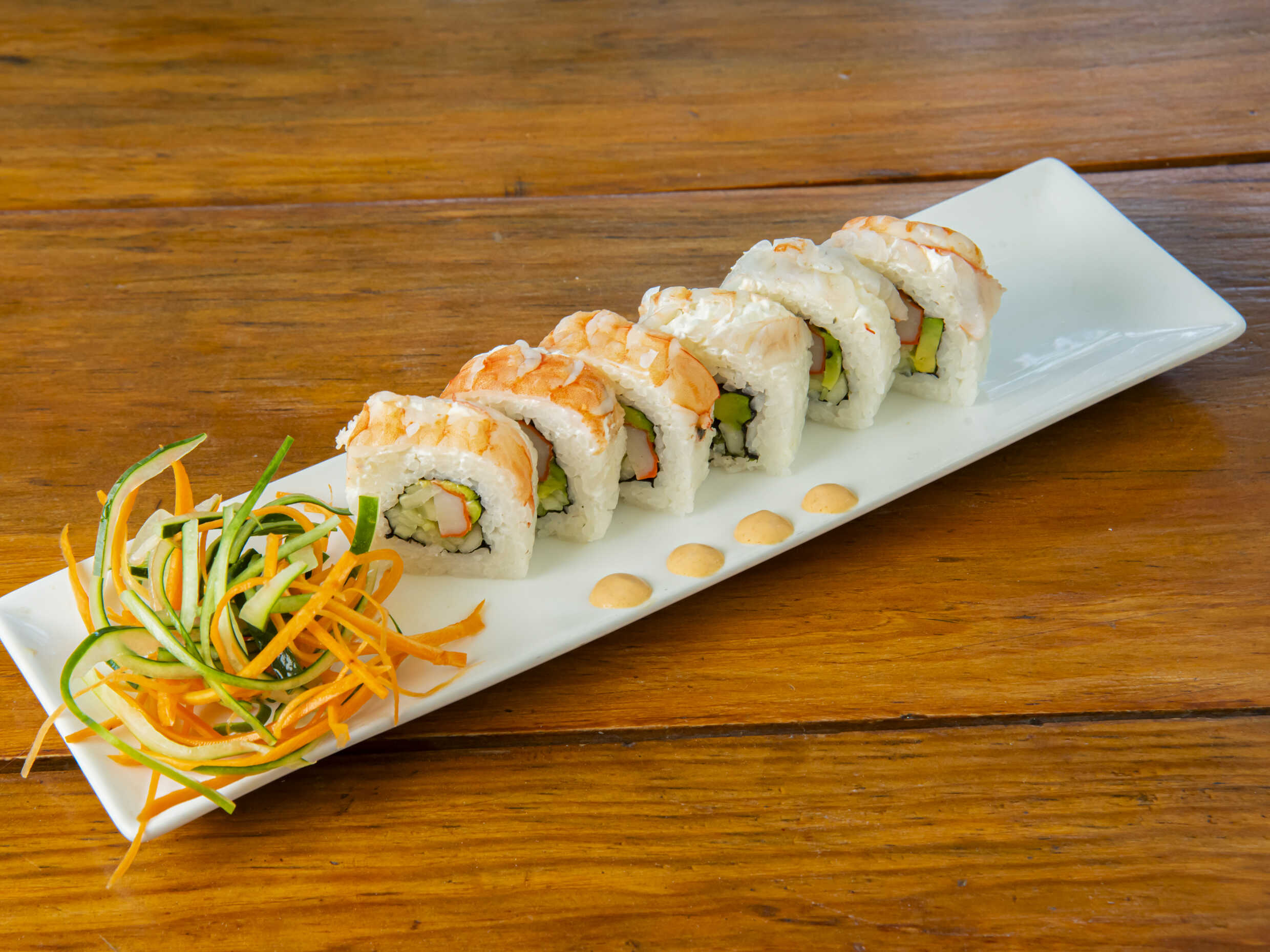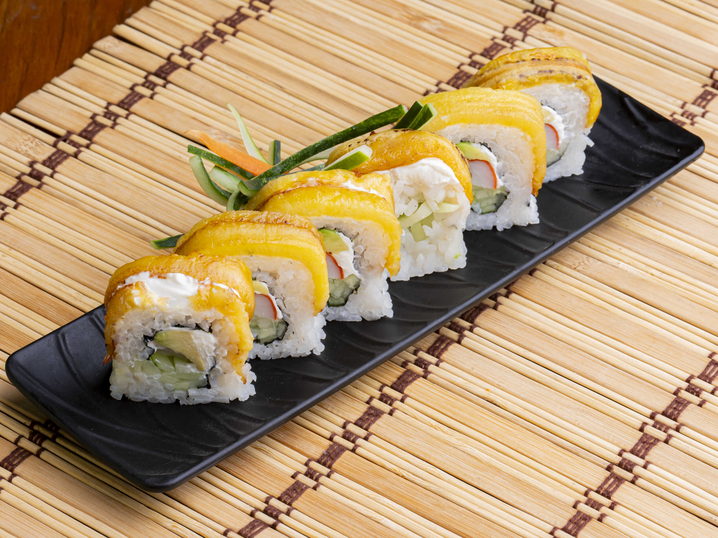 Ajonjolí por fuera, por dentro pepino philadelphia camarón tempura coronado con ensalada kani camarón empanizado bañado en salsa pantai.