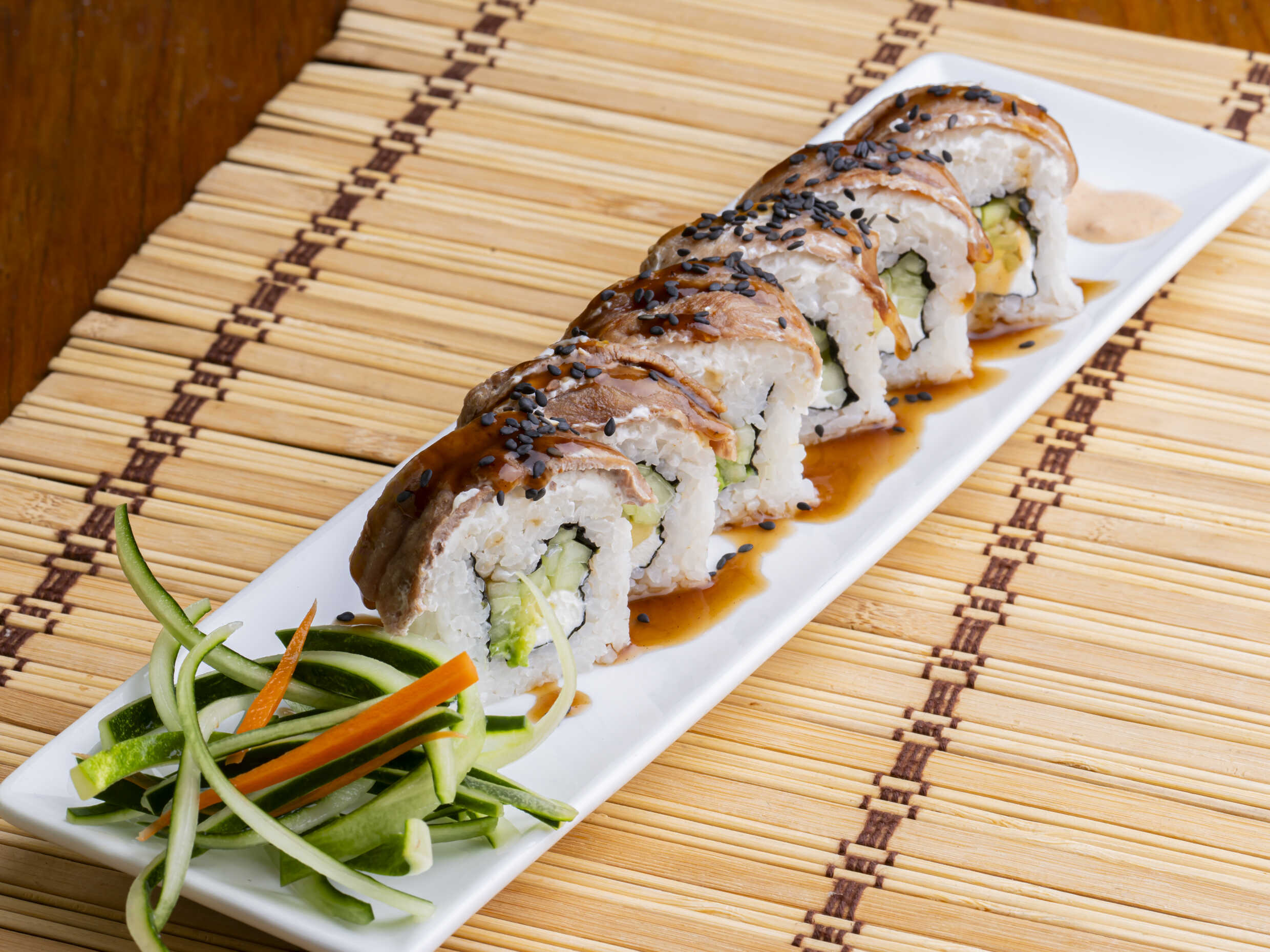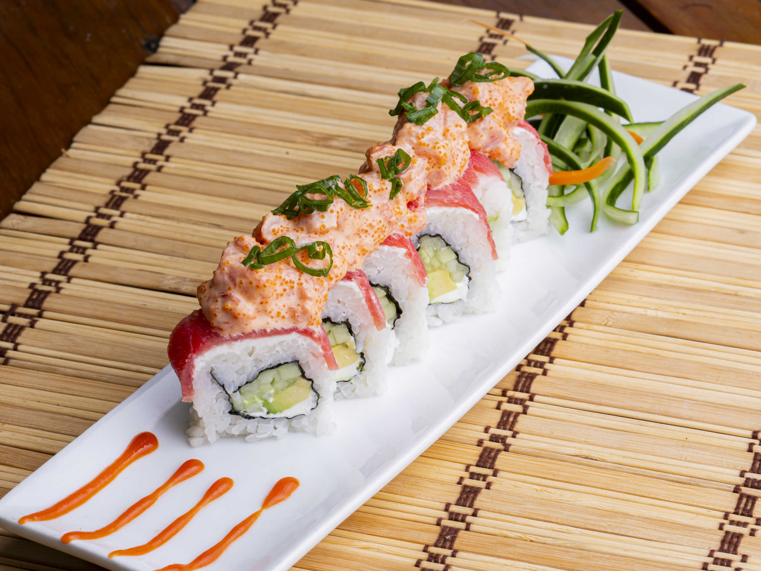 Pepino, aguacate por dentro cubierto de atún fresco coronado con ensalada de atún spicy.