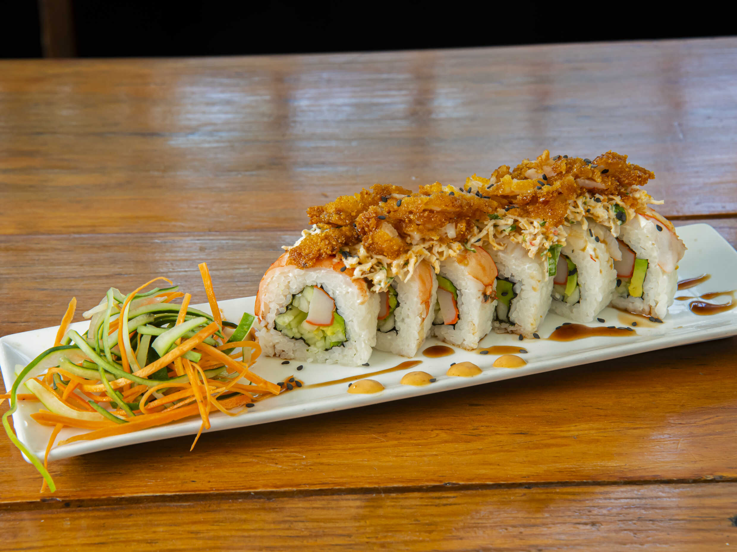 Rollo california capeado coronado con ensalada kany y camarón tempura bañado en salsa de anguila y ajonjolí.