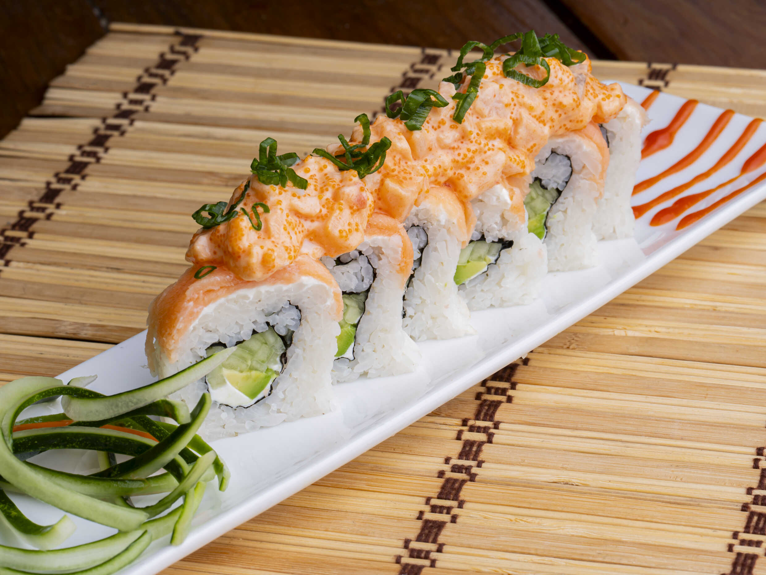Pepino, aguacate por dentro cubierto de Salmon fresco coronado con ensalada de Salmon spicy.