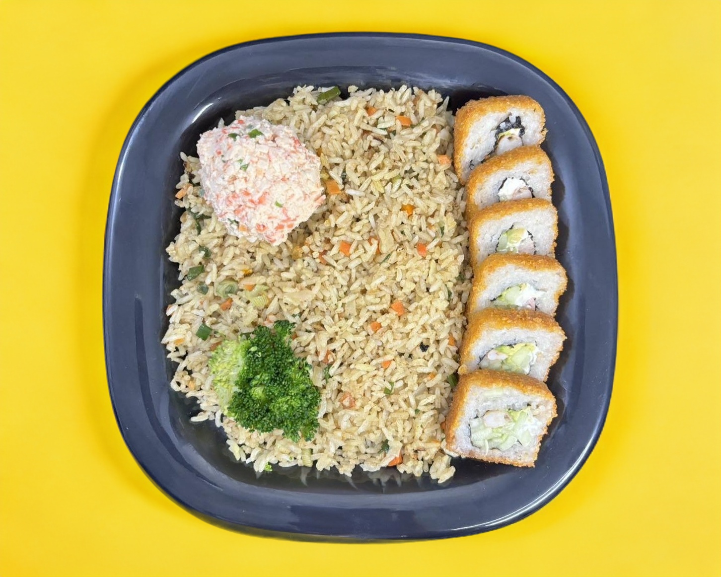 Combo individual: una porción de arroz frito, 1/2 sushi empanizado (6 bocados) y ensalada tampico. Ideal para disfrutar una combinación deliciosa y completa. 🍱✨
