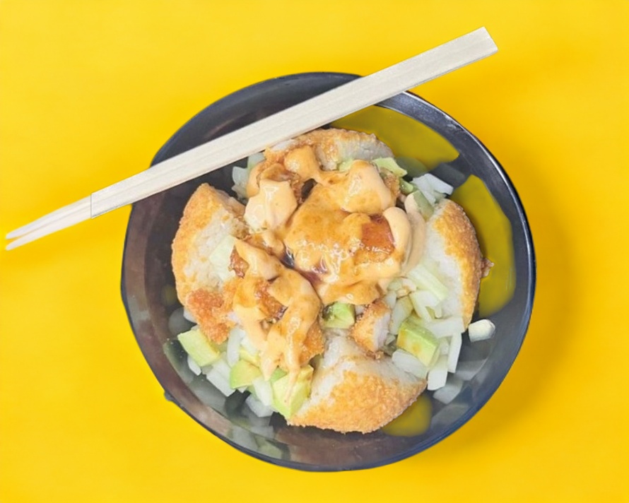 12 piezas de sushi empanizado, relleno de Philadelphia, aguacate, pepino, res y camarón, acompañado de aderezo de chipotle y salsa de soya. 🍣