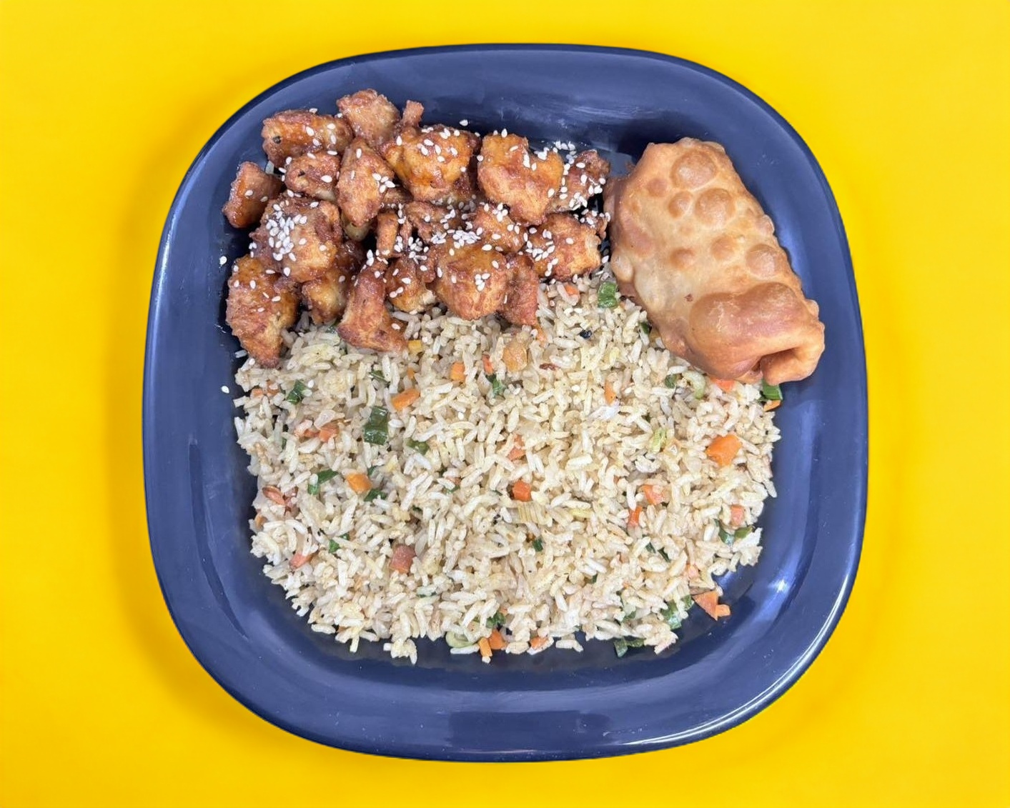 Arroz frito con pollo, 1/2 sushi empanizado y 1 pza de chunkun.