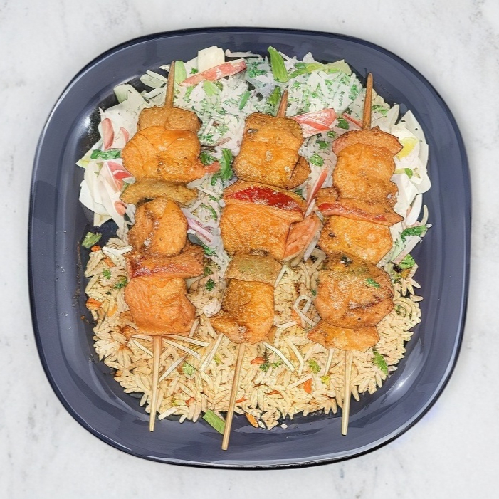 3 brochetas de camarón empanizadas, acompañadas de ensalada kany y arroz frito.