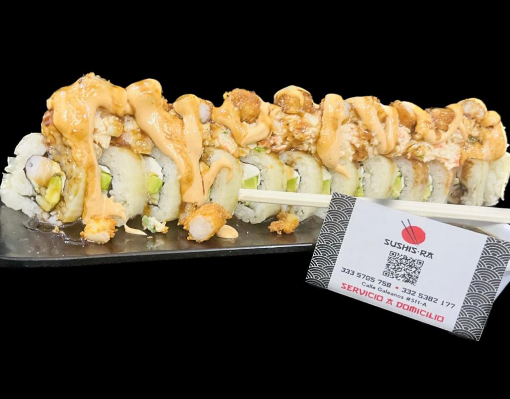 12 piezas de sushi empanizado, relleno de phiadelphia, aguacate, pepino , res, camarón, aderezo de chipotle, salsa de soya, salsa de anguila y siracha sujeta a cliente (si desea o no pedirla).