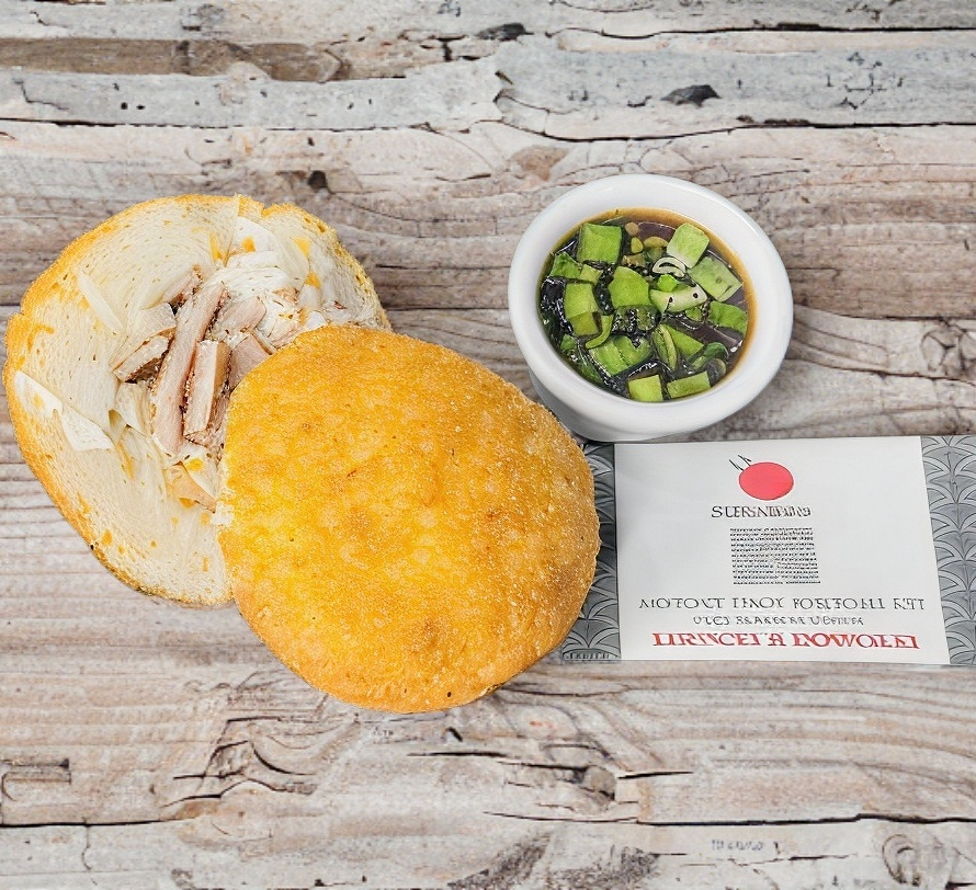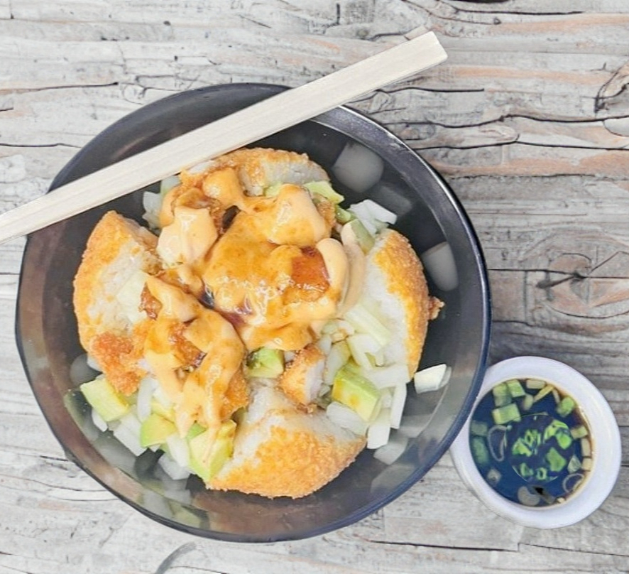 Arroz frito con pollo, 1/2 sushi empanizado y 1 pza de chunkun.