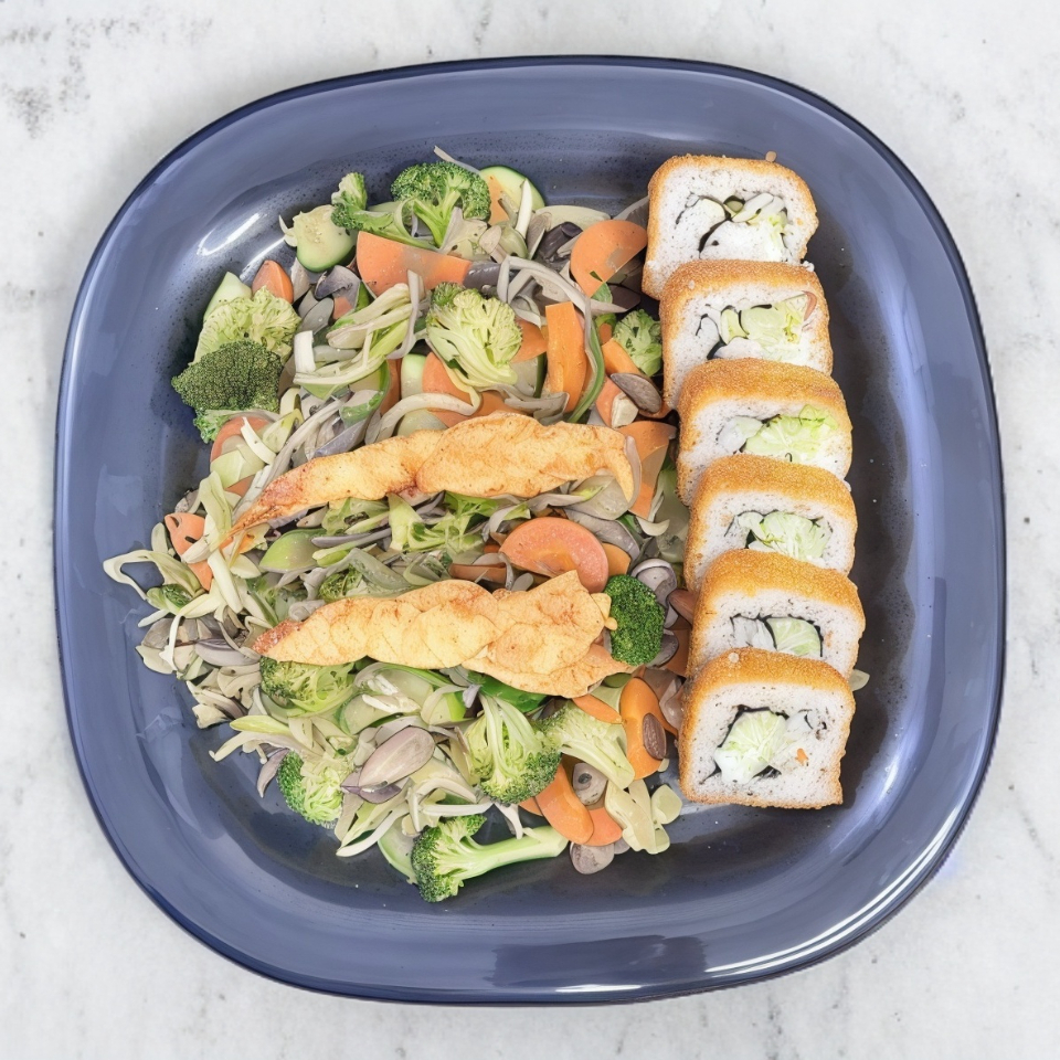 Verduras a la plancha, 2 camarones capeados y 1/2 sushi empanizados.