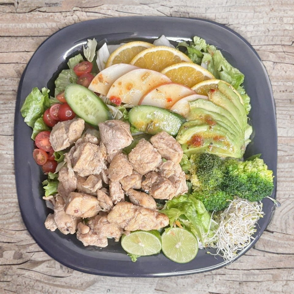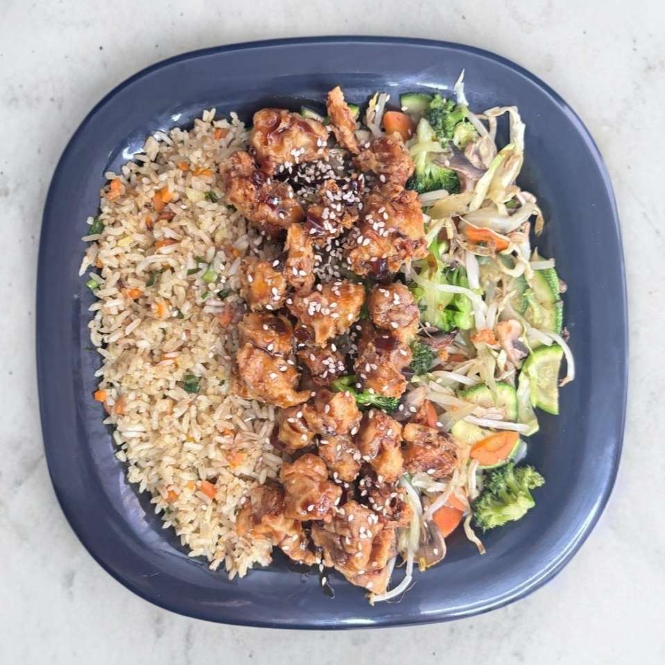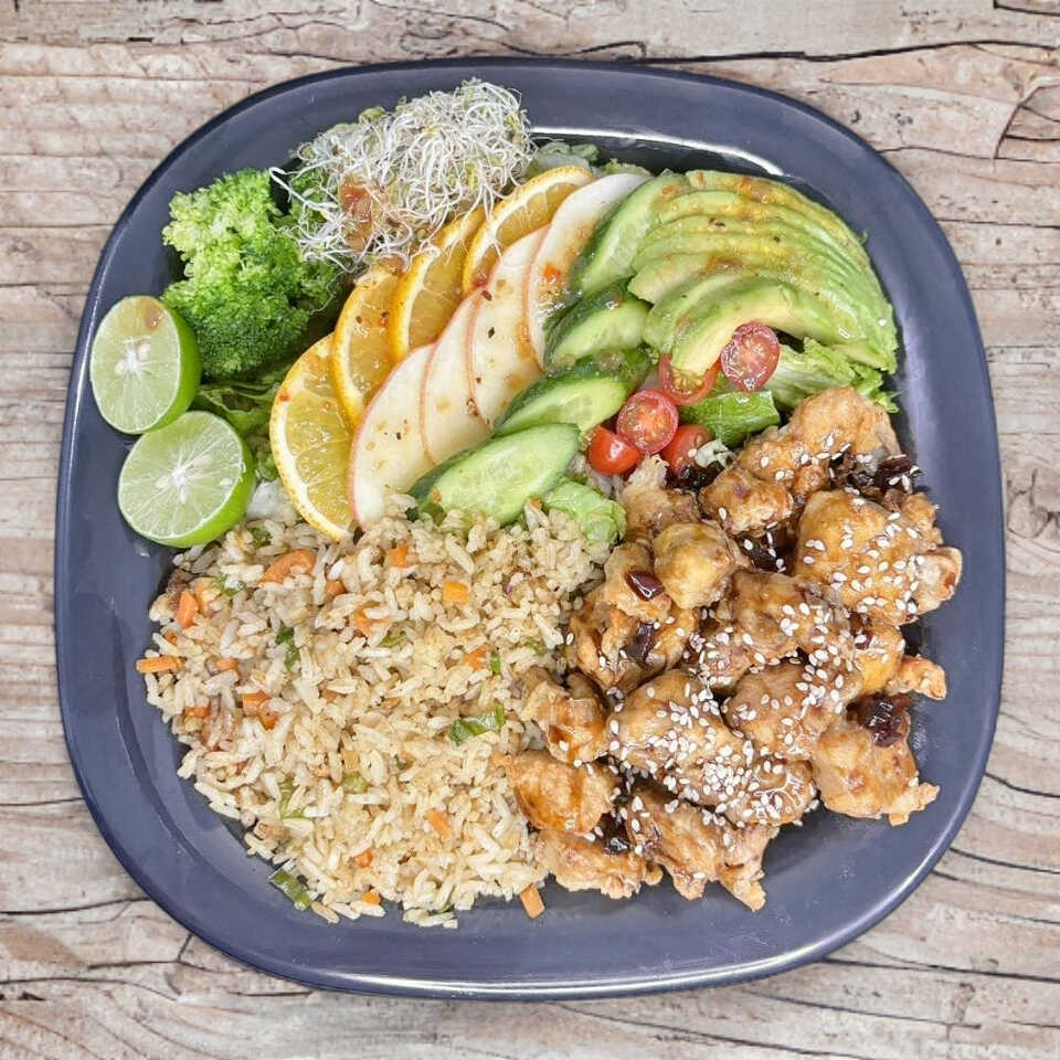 Verduras a la plancha, arroz frito y pollo capeado bañado en salsa agridulce.
