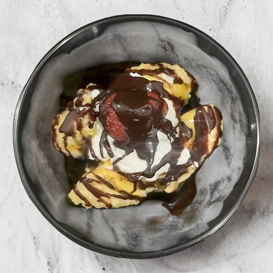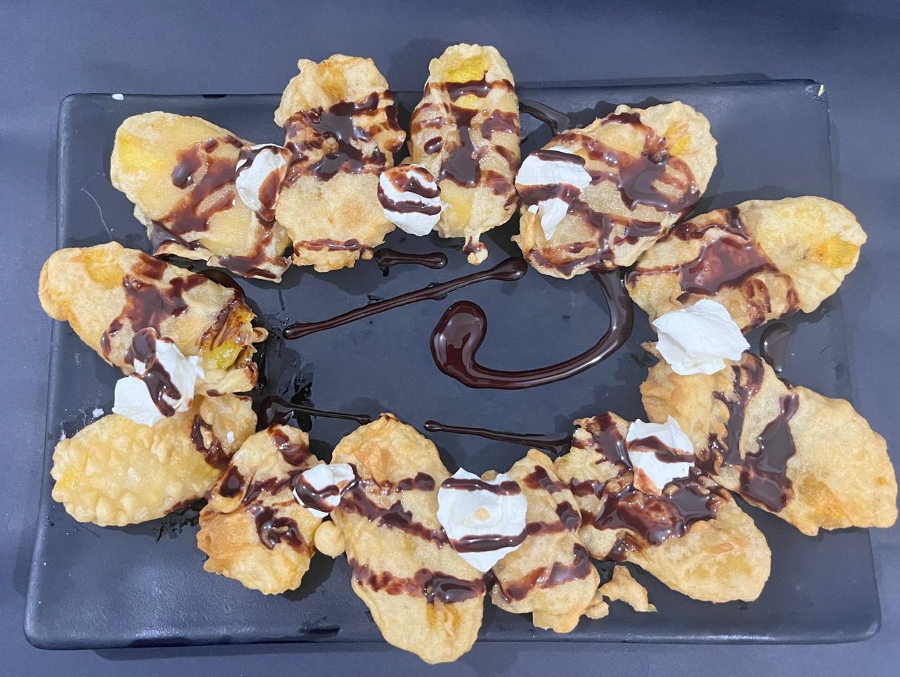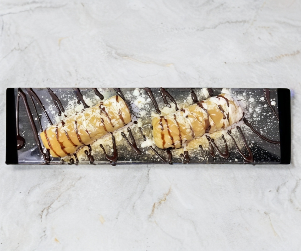 Rollito de tortilla de harina, relleno de philadelphia y mermelada de manzana, cubierto con azucar glass , canela y chocolate.
