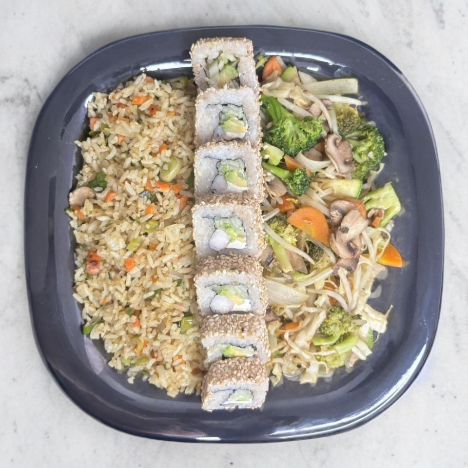 Verduras a la plancha, arroz frito y 1/2 sushi ajonjolí.
