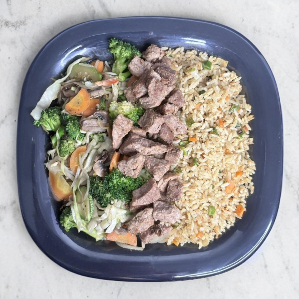 Verduras a la plancha, arroz frito, pollo, res y camarón.
