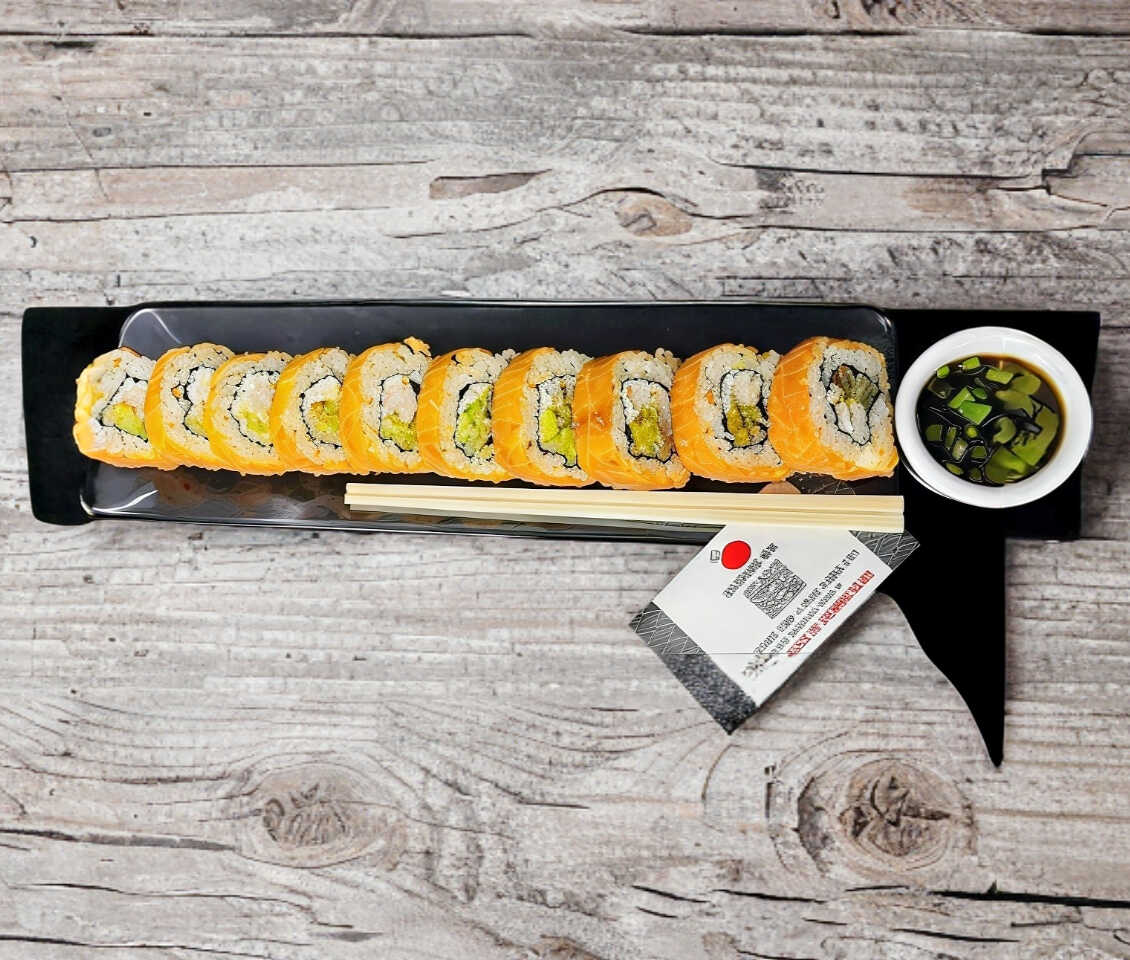 Salmon por fuera, por dentro lleva aguacate, pepino, alga, Philadelphia y la proteína de su elección.