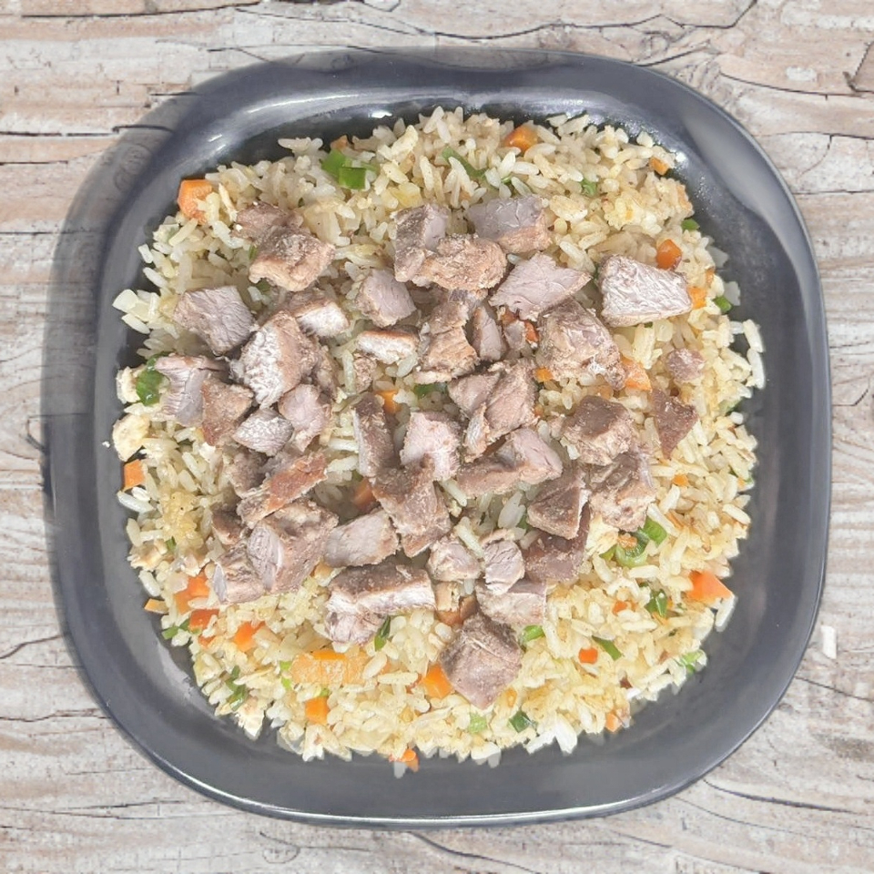 Arroz frito, con trocitos de res, verdura, zanahoria, cebolla, cebollin, aderezo, salsa de soya con chile, salsa de anguila y siracha sujeta a cliente (si desea o no pedirla).