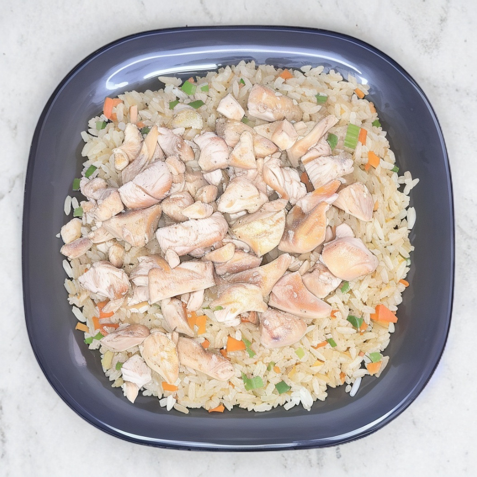 420 gr aprox, arroz frito con pechuga a la plancha para una persona