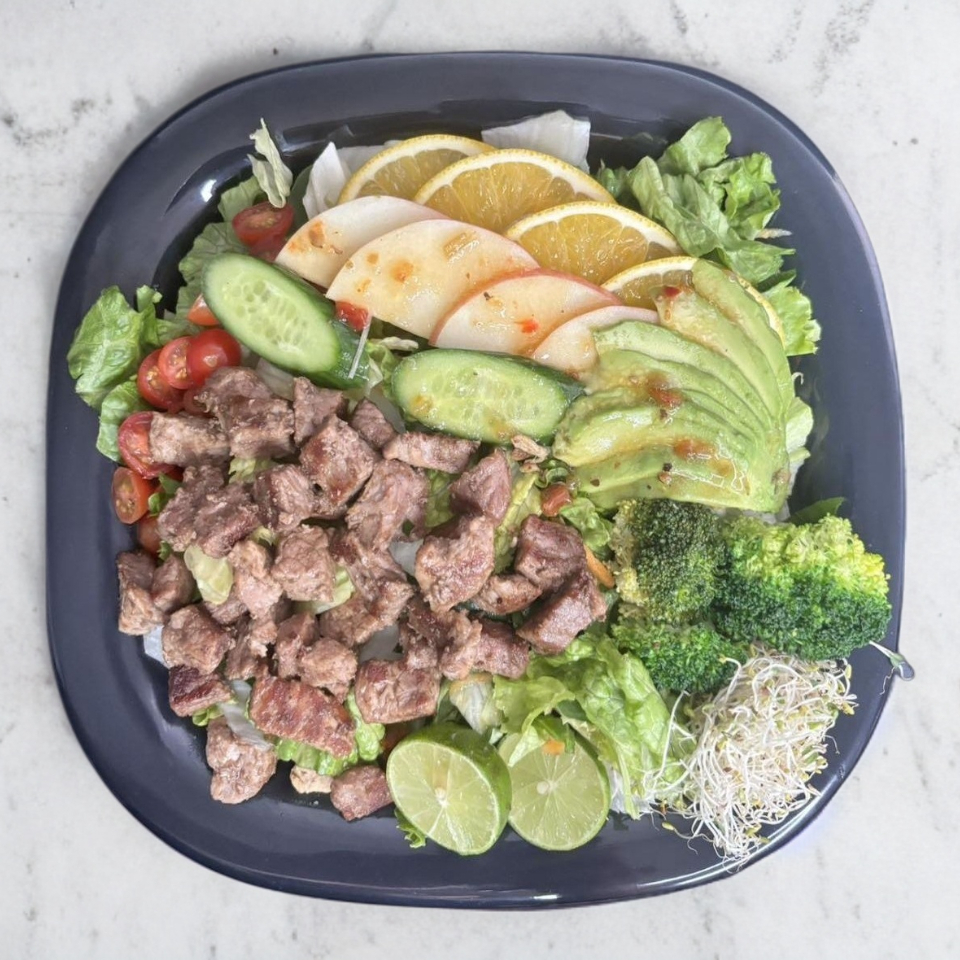 Champiñón, brócoli, cebolla, res y fideo chowmein a la plancha sazonado con salsa teriyaki.