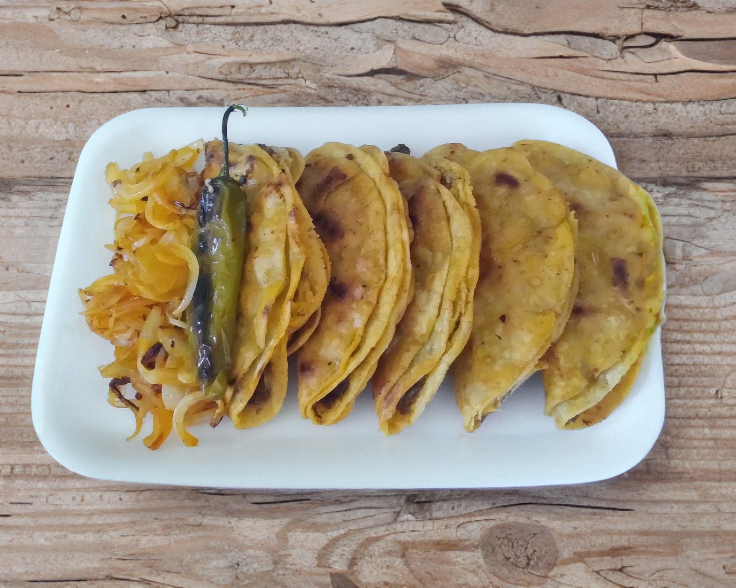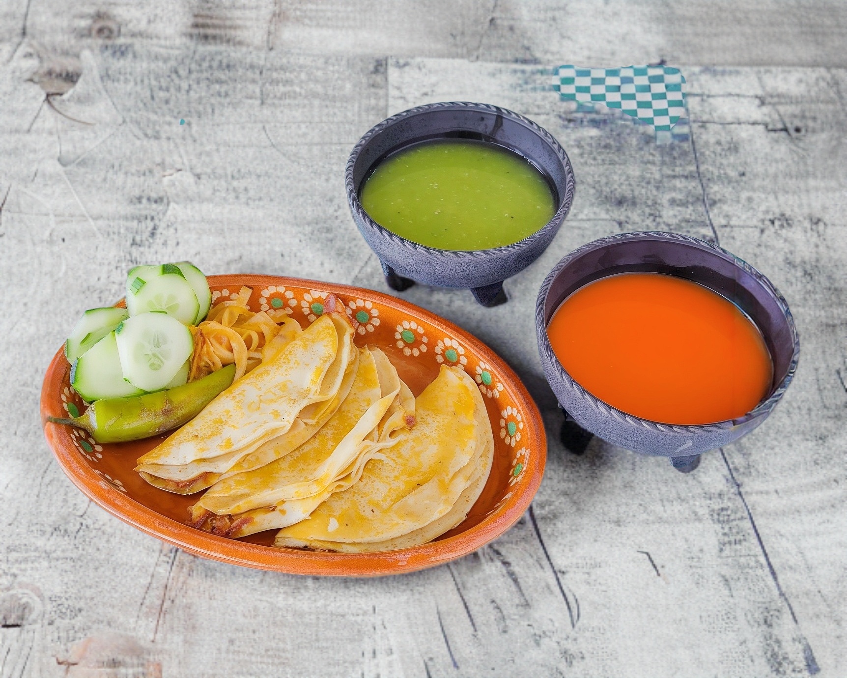 Chorizo Doradito con Queso Derretido en Tortilla de Harina acompañado de verduras y salsas