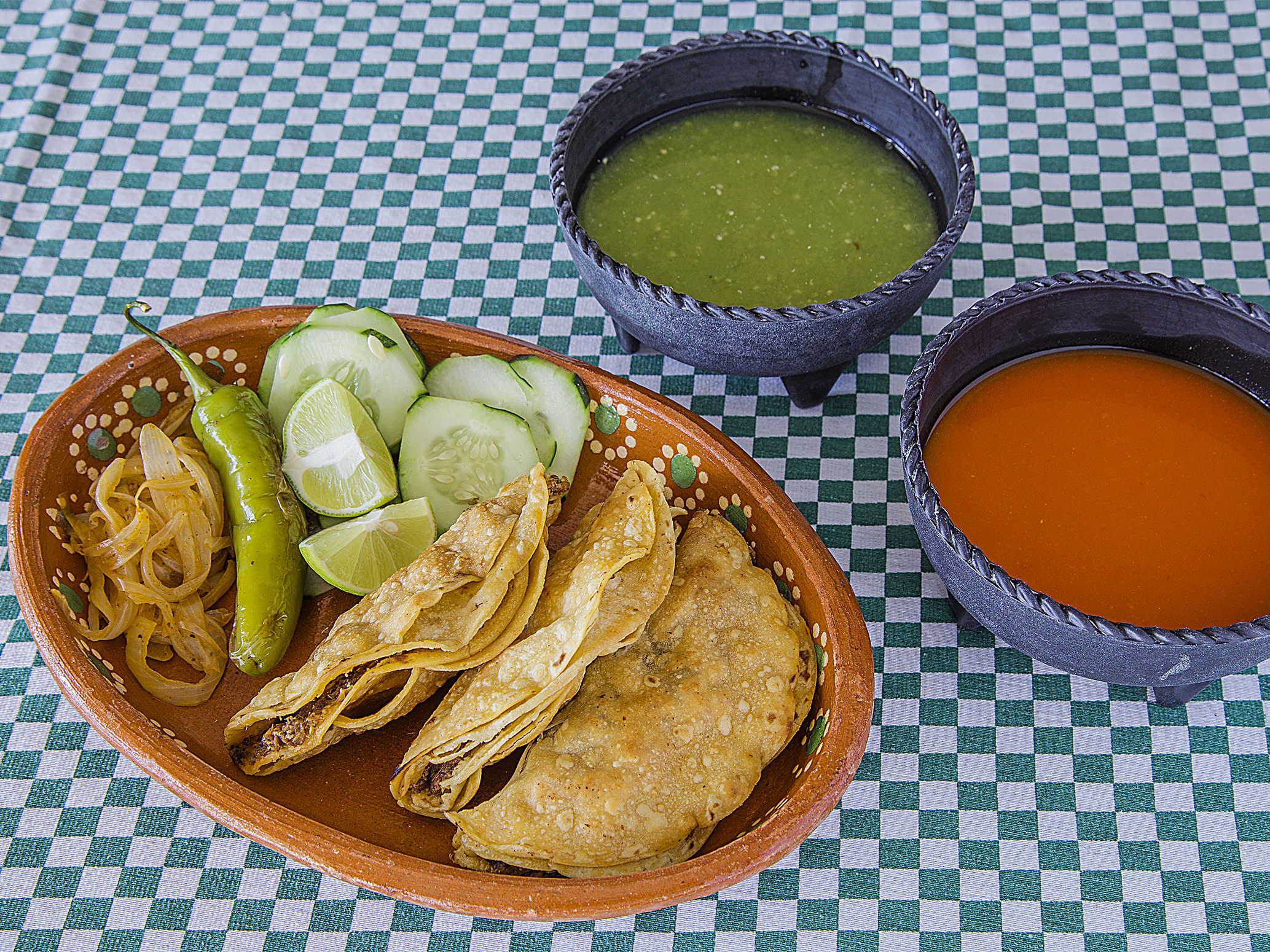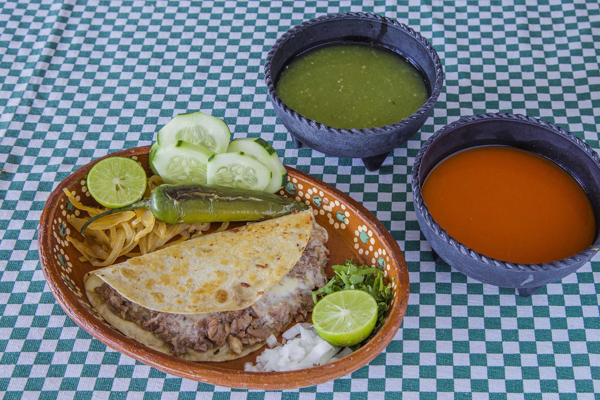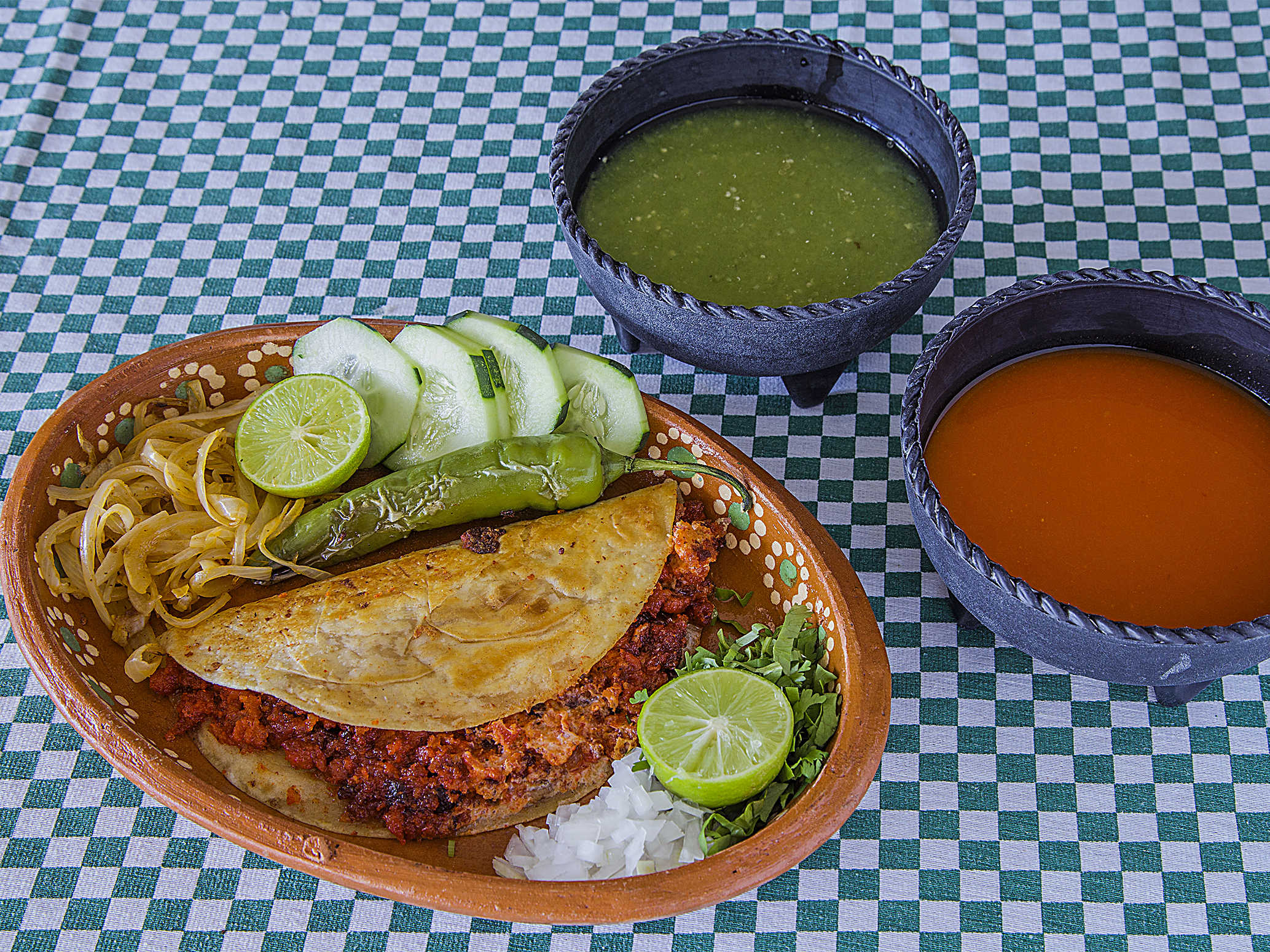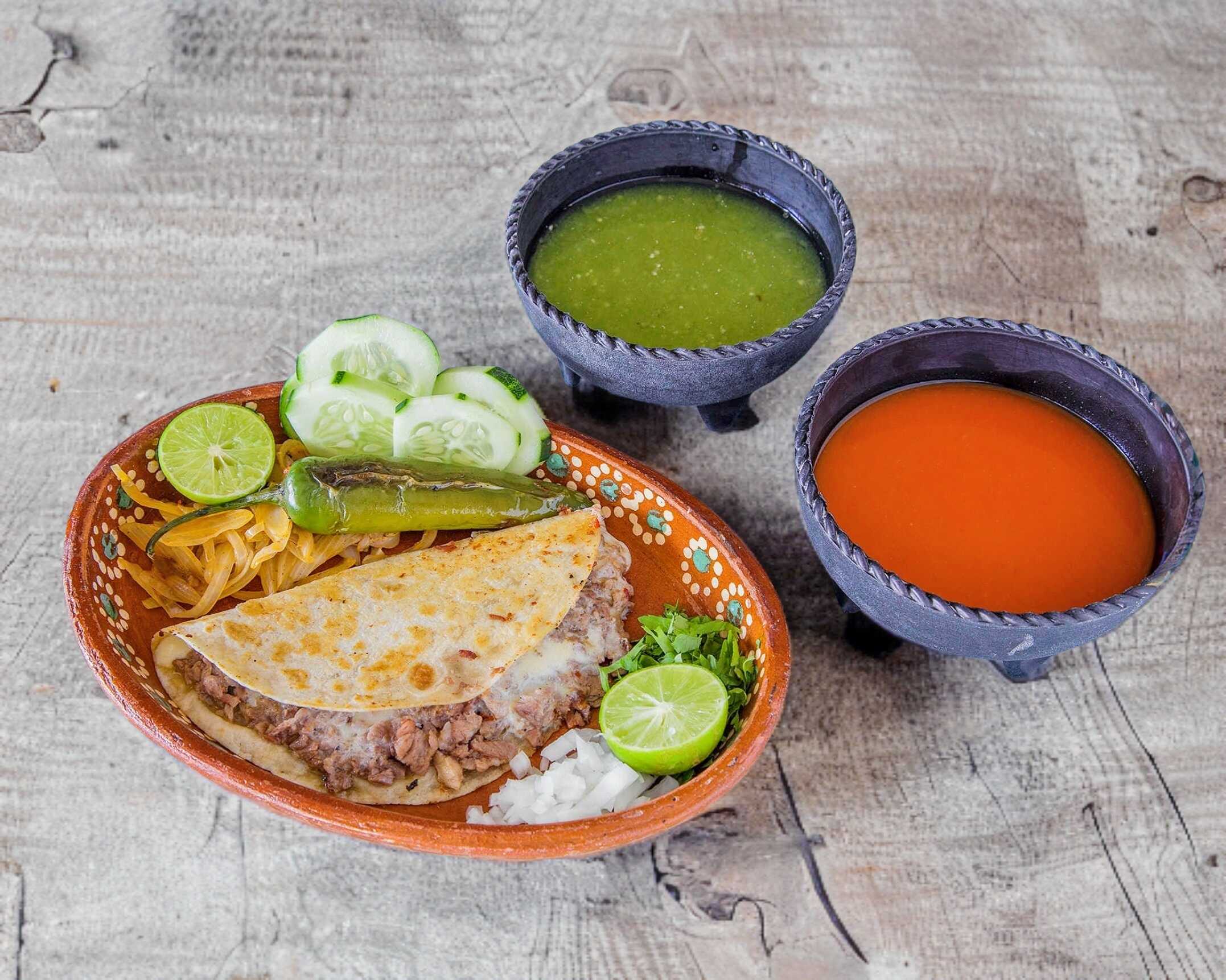 Cebolla, Cilantro, Limones y Salsas.