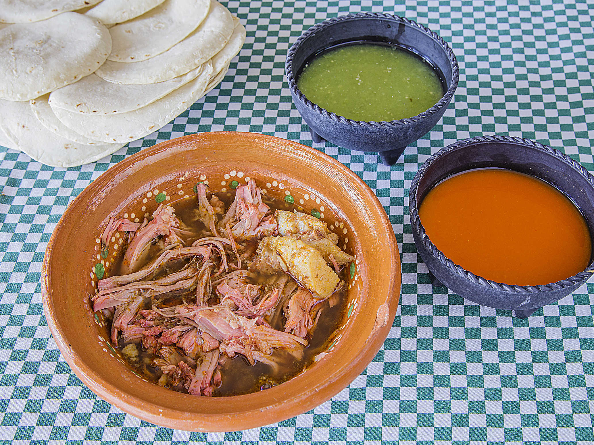 Caldito de la Birria, Cebolla, Cilantro, Limones y Salsas.
