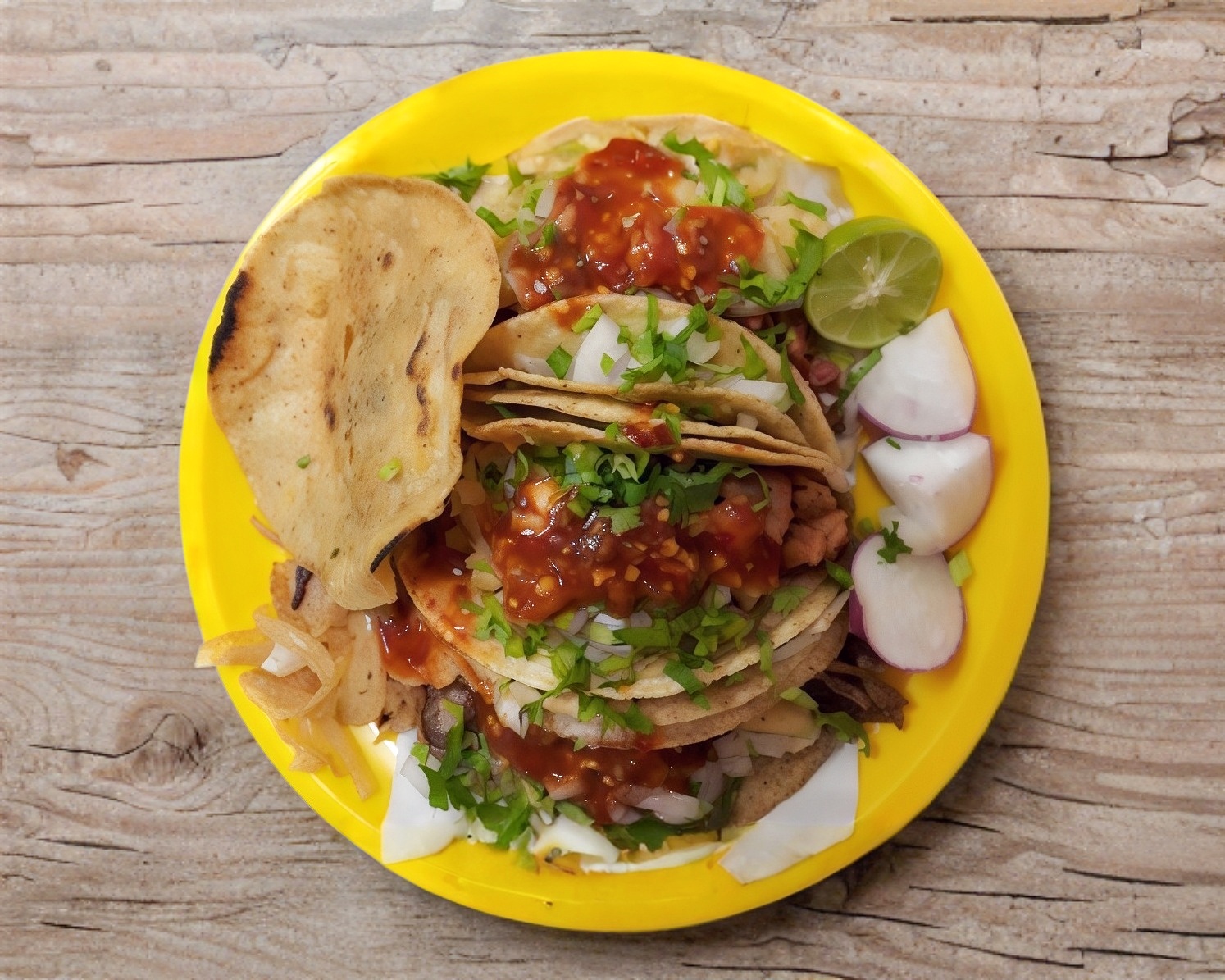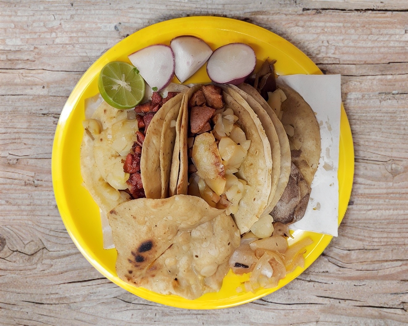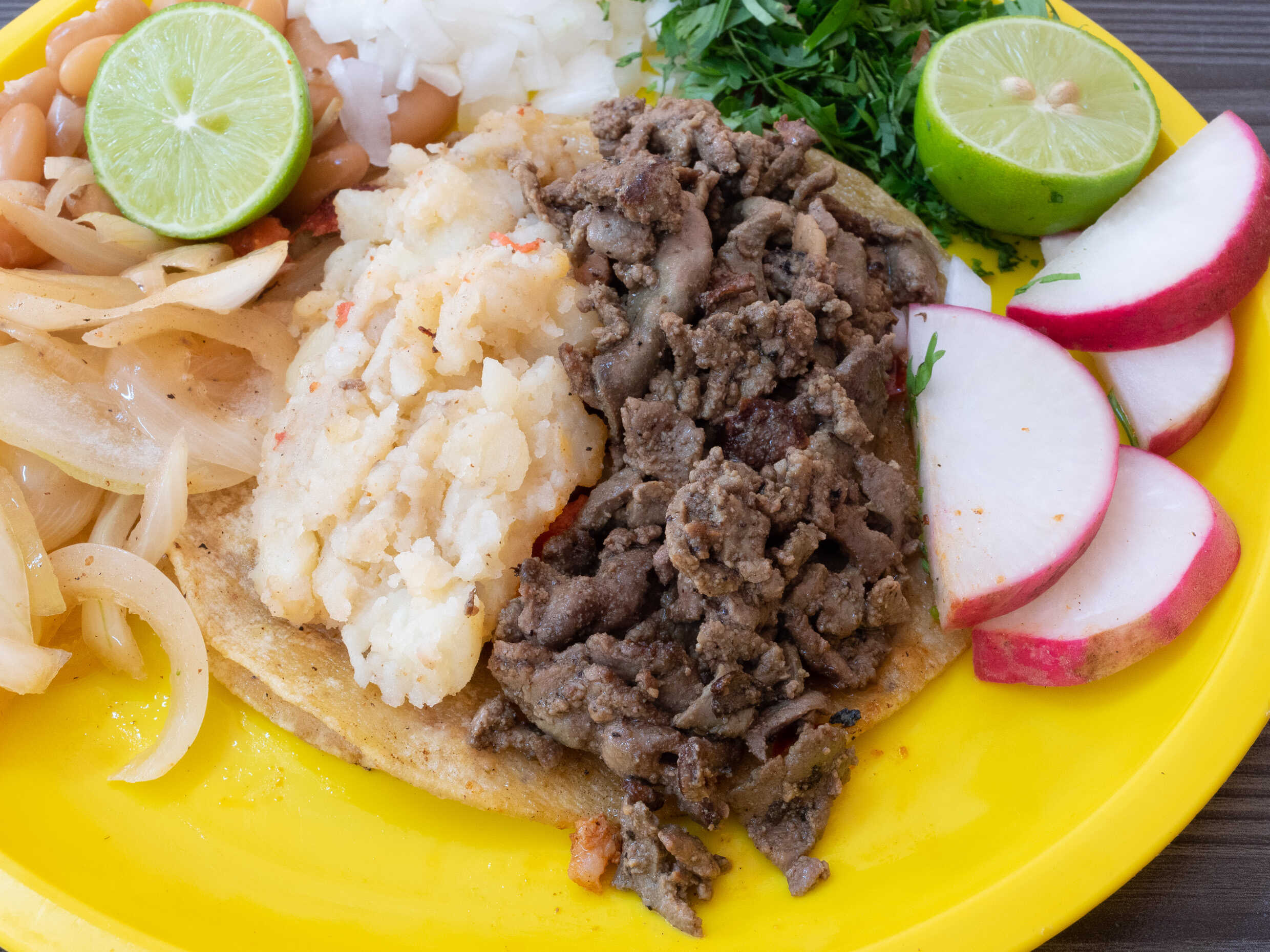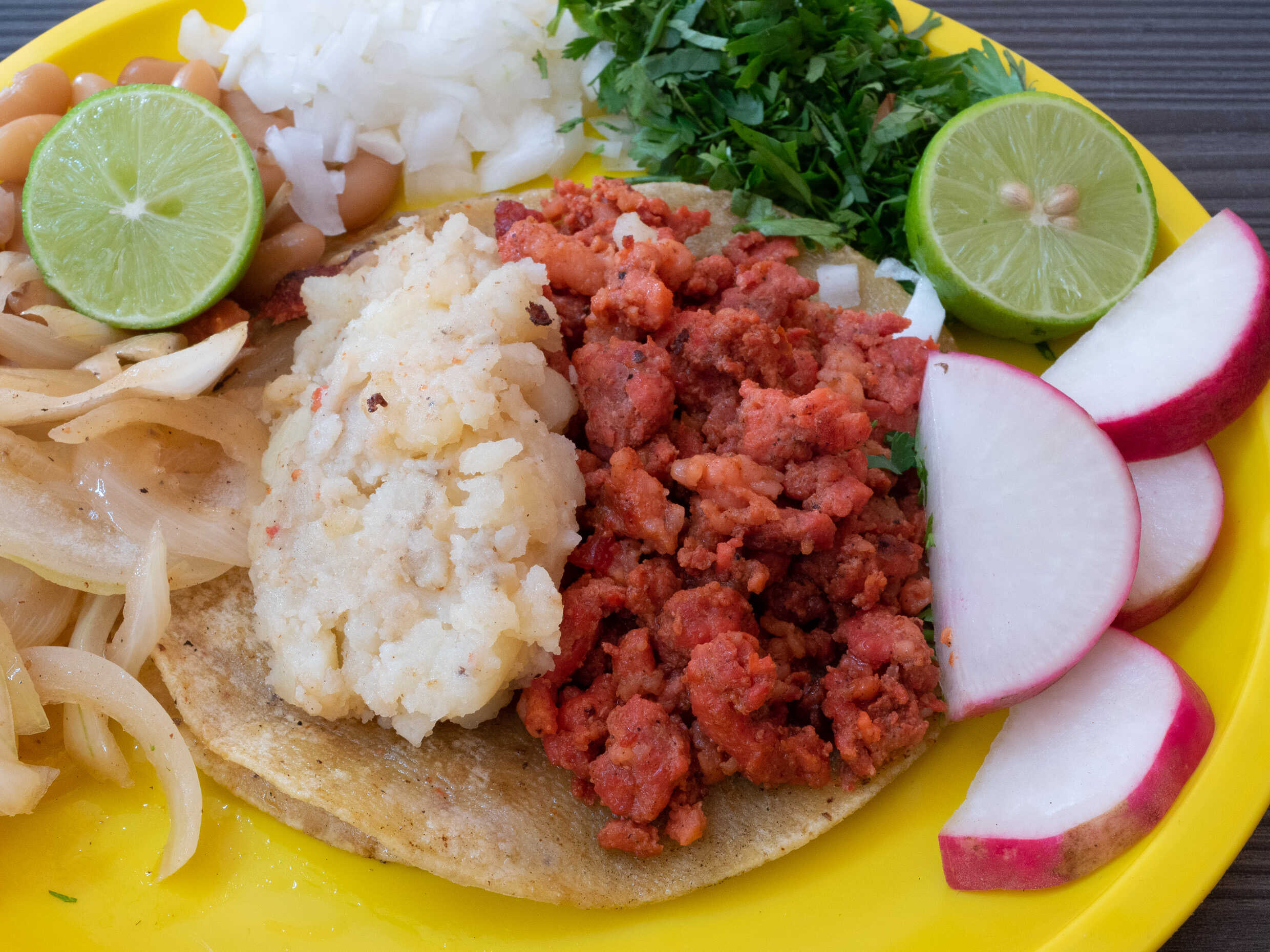 Un taco de chorizo con papa, acompañado de cebolla, cilantro, limón y salsa. No incluye arroz.