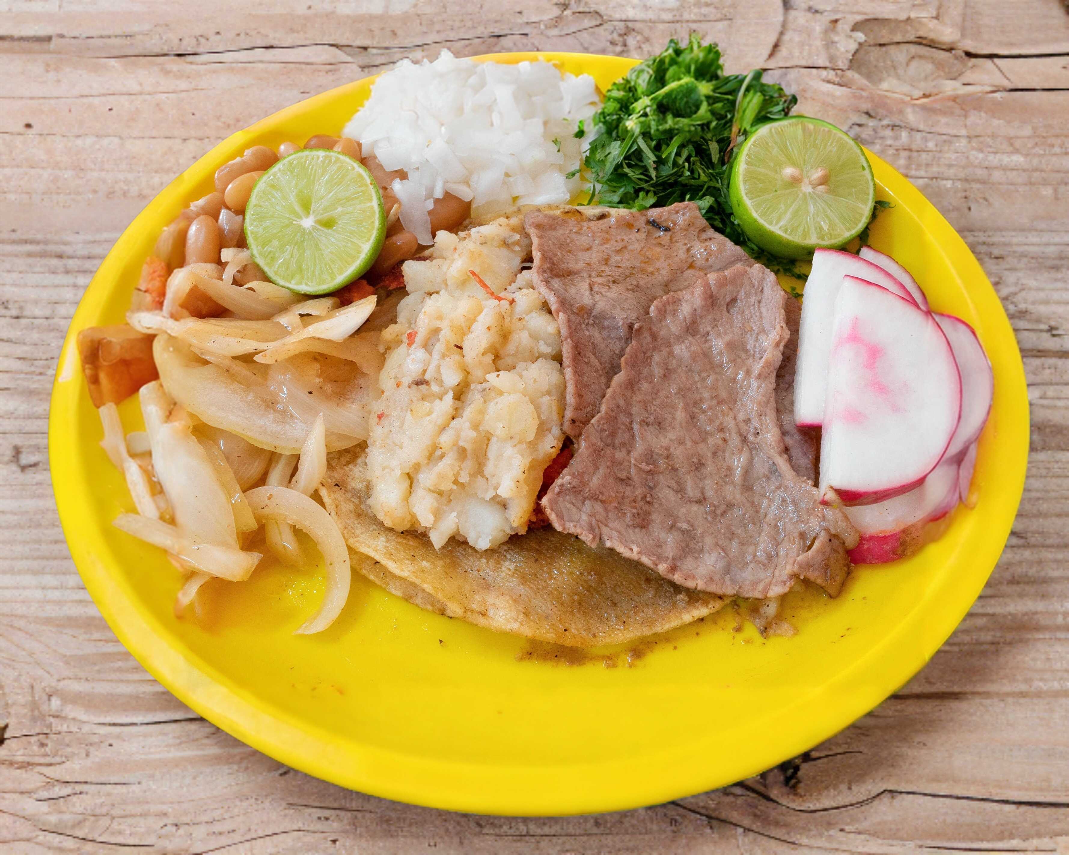 Taco de bistec en tortilla de maíz, acompañado por cebolla, cilantro y limón por aparte. Incluye salsa de chile habanero