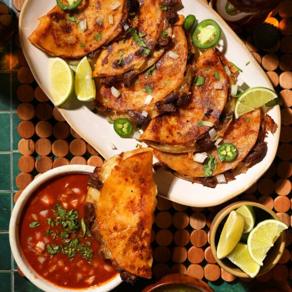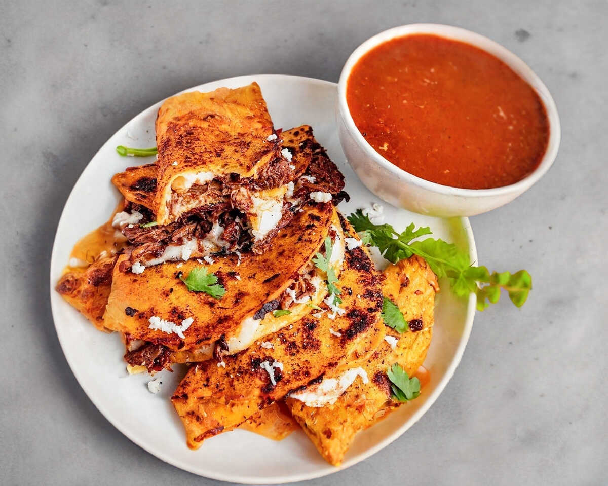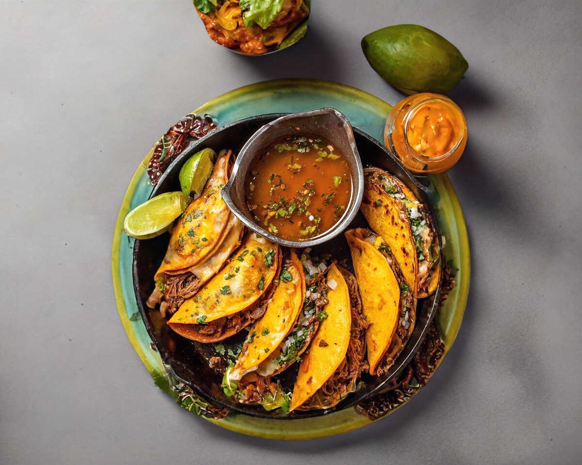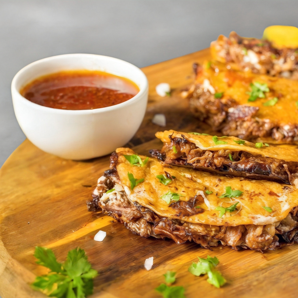 RICA QUEABIRRIA CON QUESO MOZARELLA ACOMPAÑADO CON CEBOLLA PEPINOS LIMON PICANTE