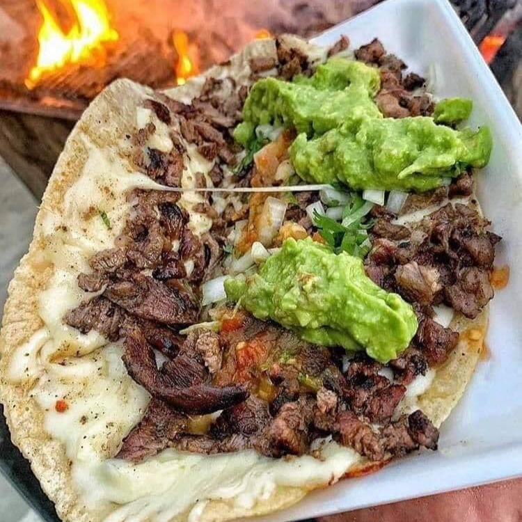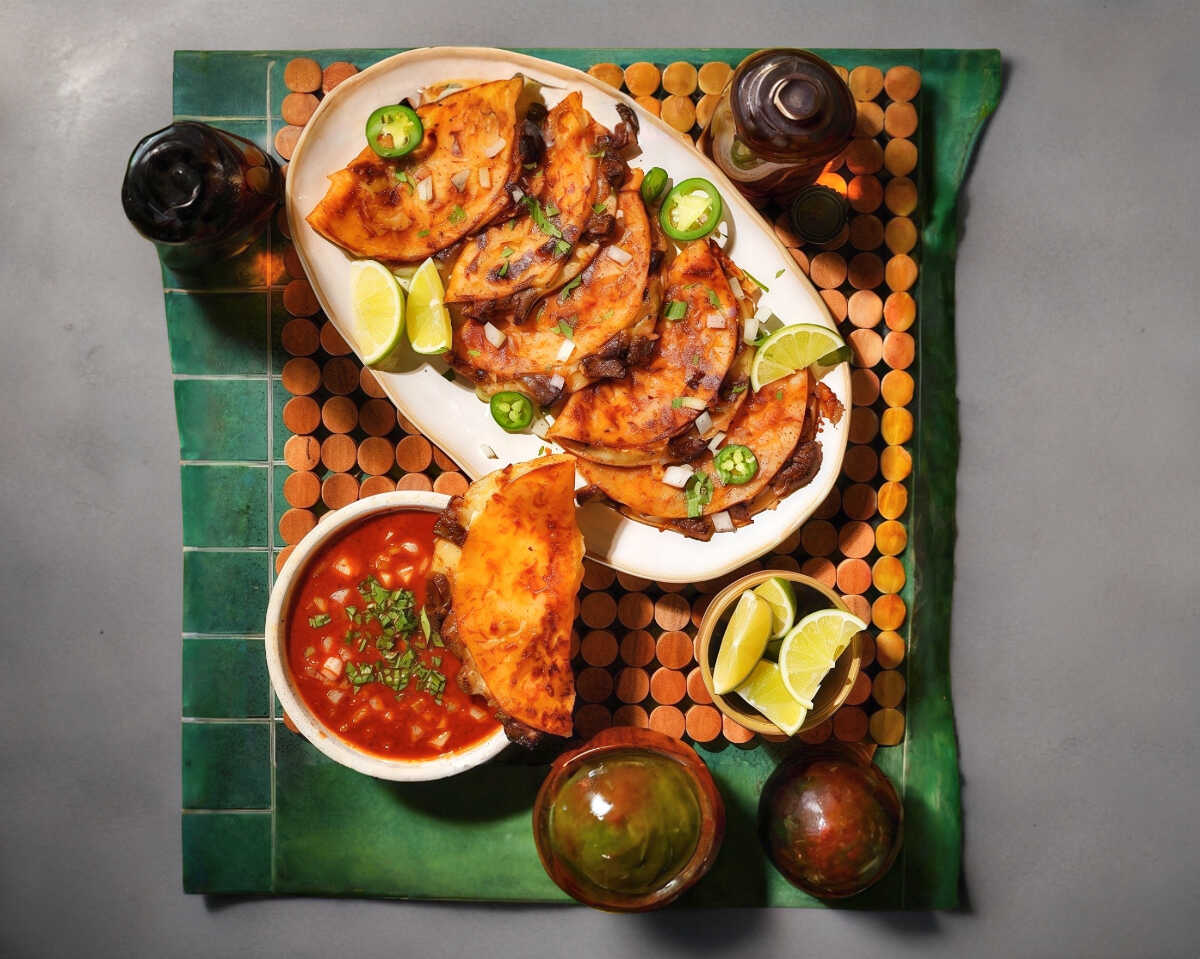 RICA QUESADILLA DE ASADA CON TORTILLA DE MAIZ ACOMPAÑADO CON CEBOLLA FRIJOLES PEPINOS LIMON PICANTE
