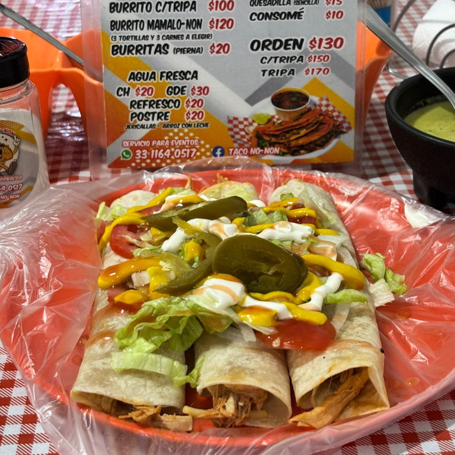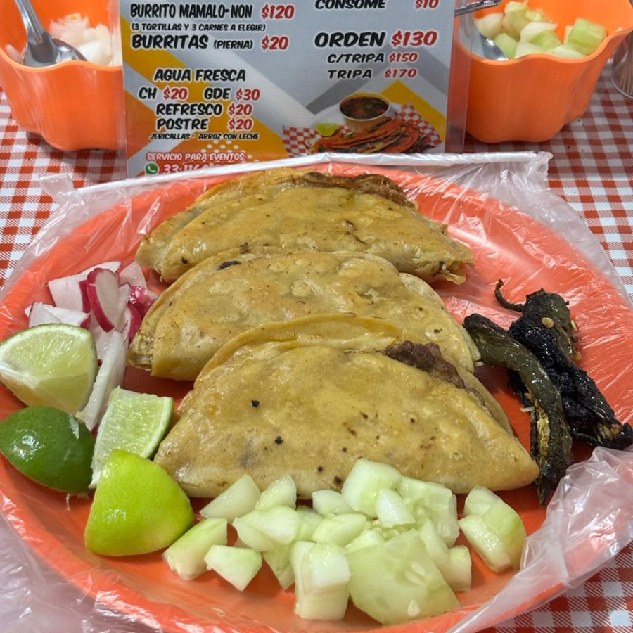 3 tortillas de harina de tamaño muy granden especial, 3 guiso a elegir (barbacoa bistec arrachera chorizo papas con chorizo o adobada) incluye un toque de salsa tipo guacamole cebolla cruda cilantro cebolla guisada queso de adobera frijol refrito