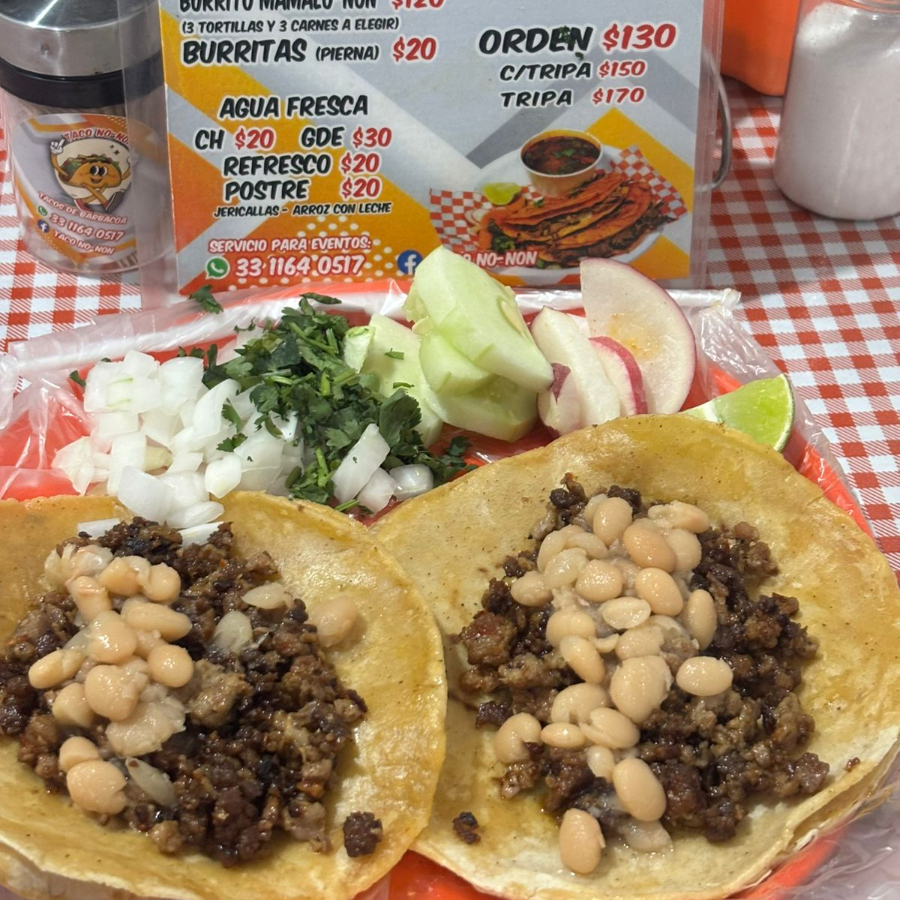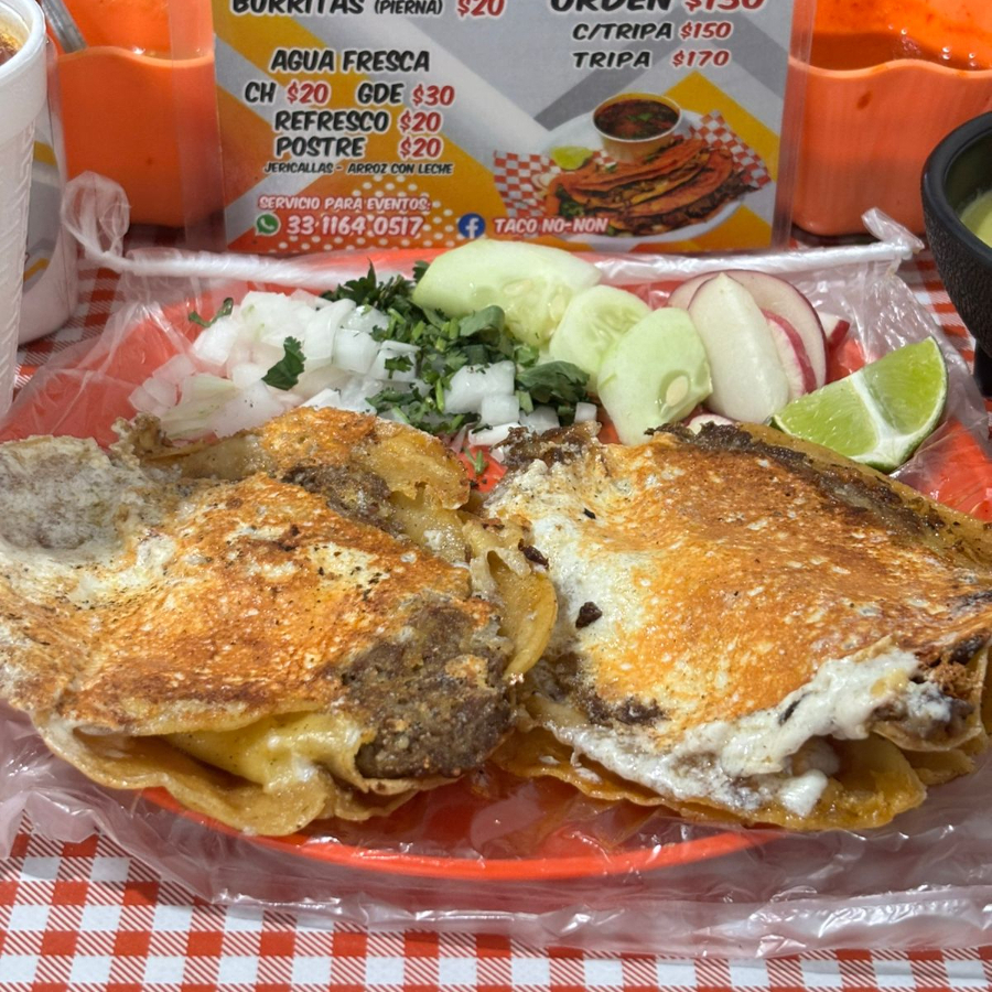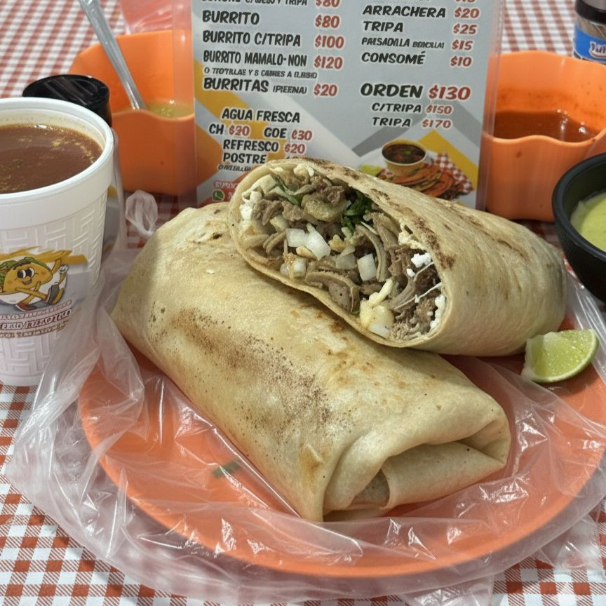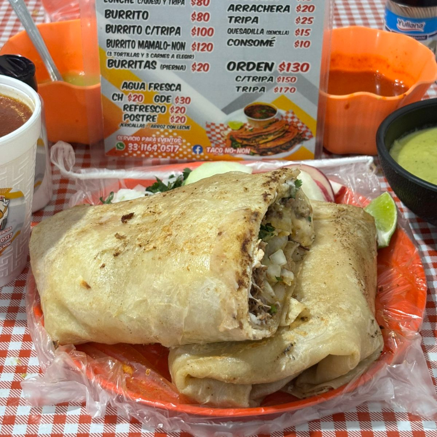 2 tortillas grandes especiales de harina un guiso a elegir (barbacoa bistec chorizo papas con chorizo arrachera adobada) incluye cebolla guisada cebolla cruda cilantro un toque de una salsa tipo guacamole queso adobera frijoles refritos