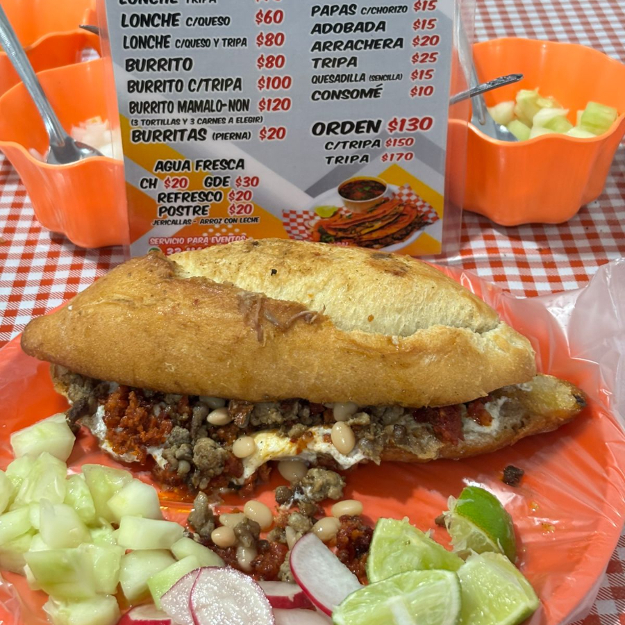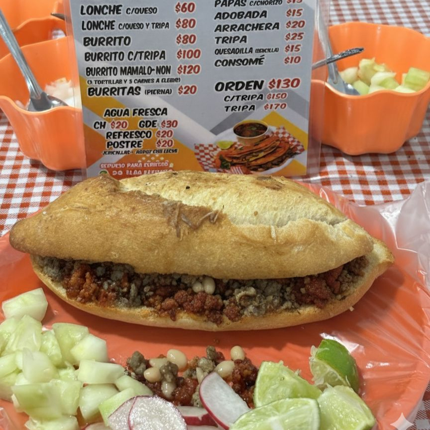 Birote tamaño normal con un leve dorado y queso adobera fundido la espacialidad barbacoa con queso . Puede elejir cualquier guiso bistec chorizo papas con chorizo arrachera adobada