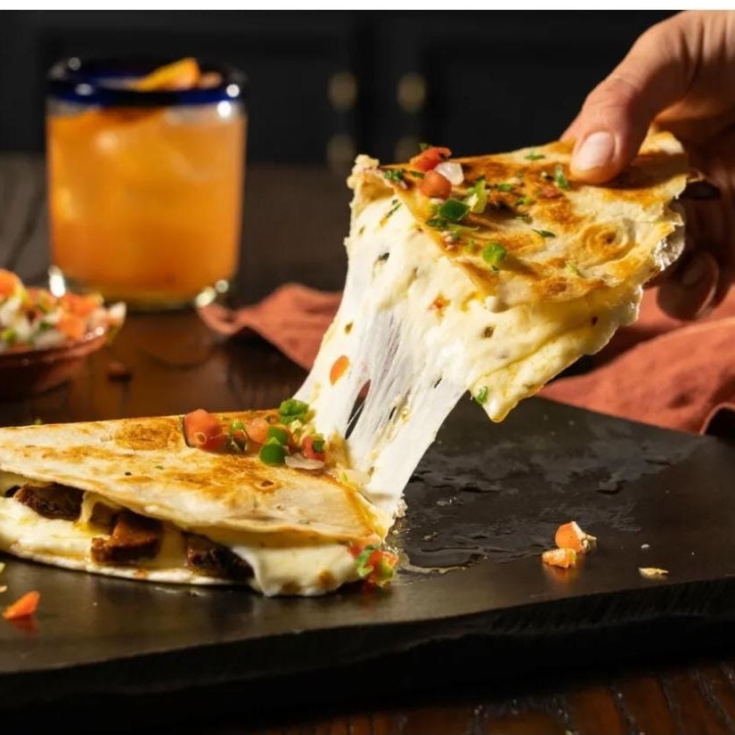 Delicioso mezcla de jitomate, cebolla, poblano ajo y camarón en una quesadilla de tortilla de maiz dorada, acompañada de salsa mexicana con repollo, mayonesa chipotle y cebola encurtida con habanero
