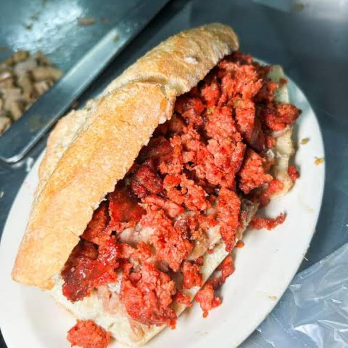 Pan birote calientito, sobre este la bistec picado coronamos con cebolla y cilantro picaditos, acompañados con salsita verde y roja