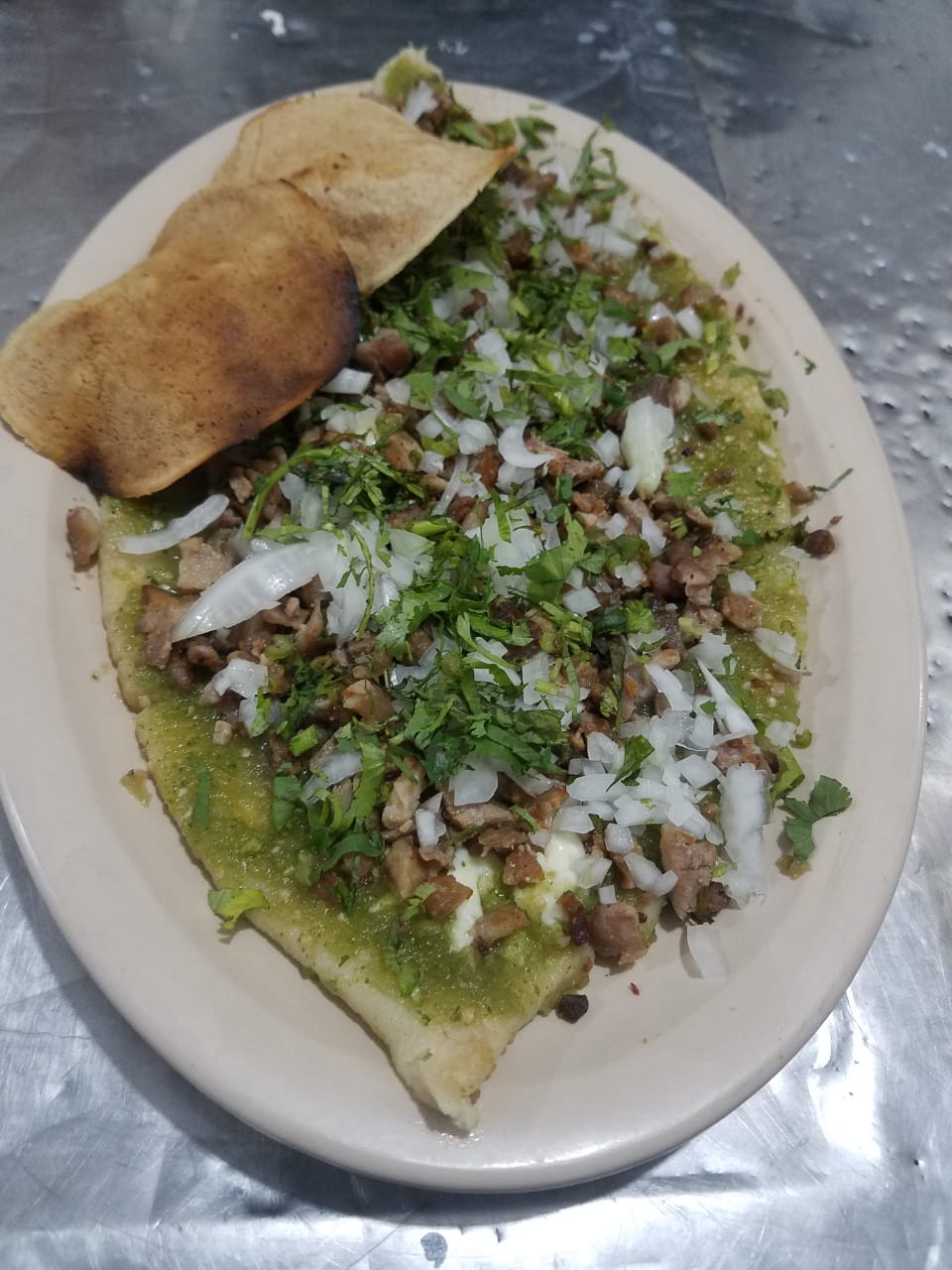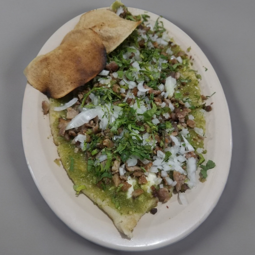 Mediano Pan, carne al pastor, queso,cebolla y cilantro salsa roja y verde