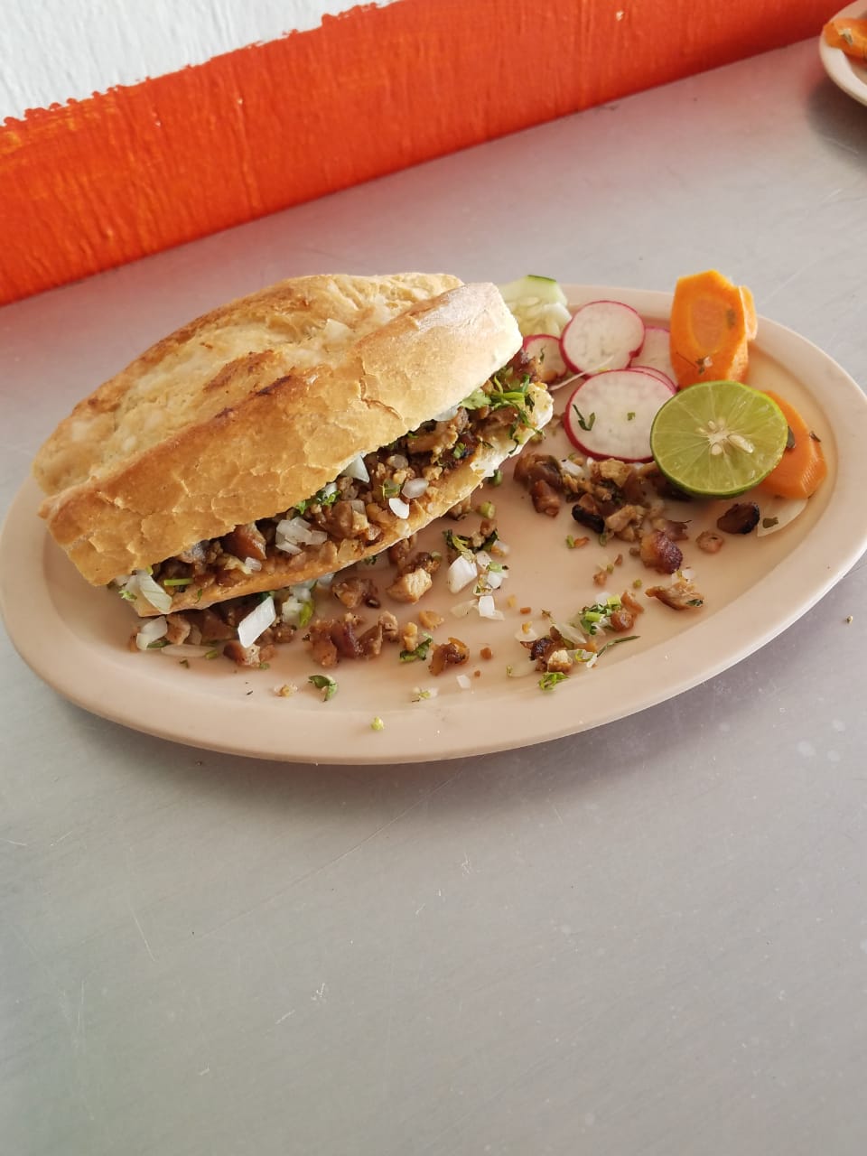 1 Lonche de pastor contiene: 1 pan mediano, limón, verdura, salsa roja y verde y 1 agua de día.