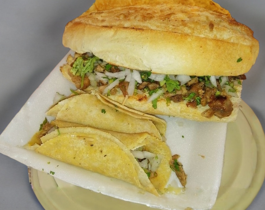 1 Pan mediano, carne al pastor, cebolla y cilantro; (salsa roja y verde, limón). Van aparte.