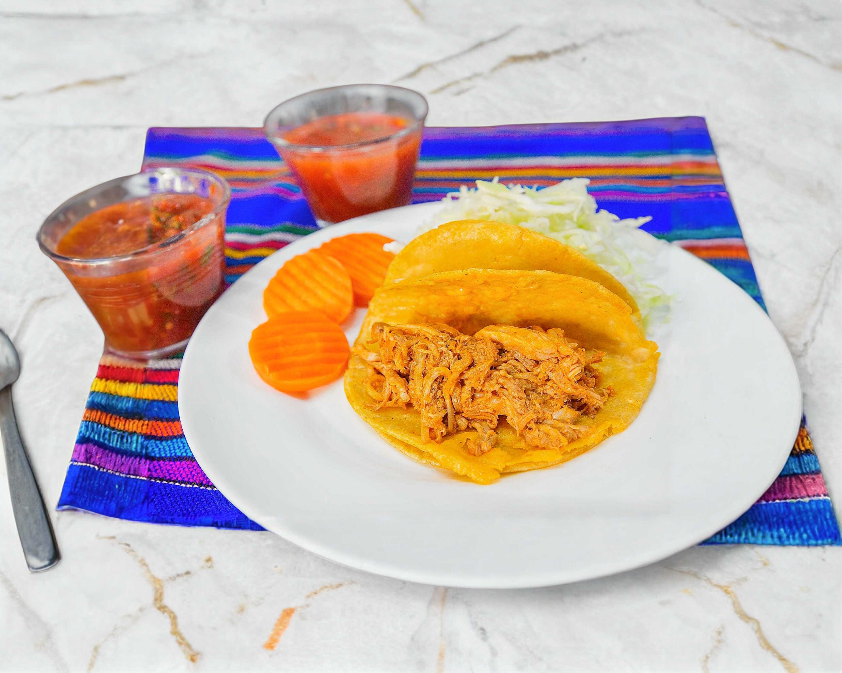 1 Taco a base de tortilla de maíz doble relleno de Chicharrón (40 gramos) Acompañado con salsa dulce, col, zanahoria y chile martajado.