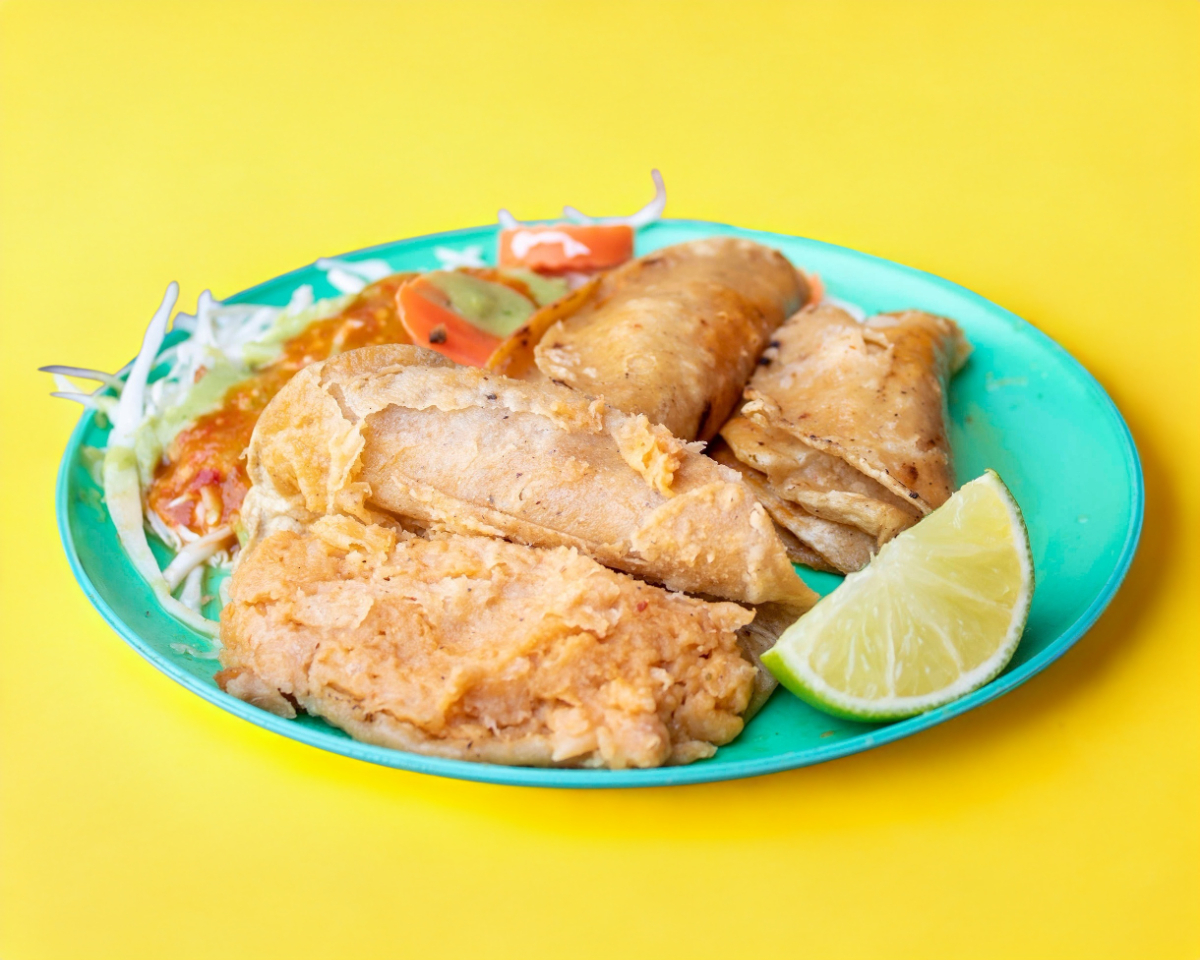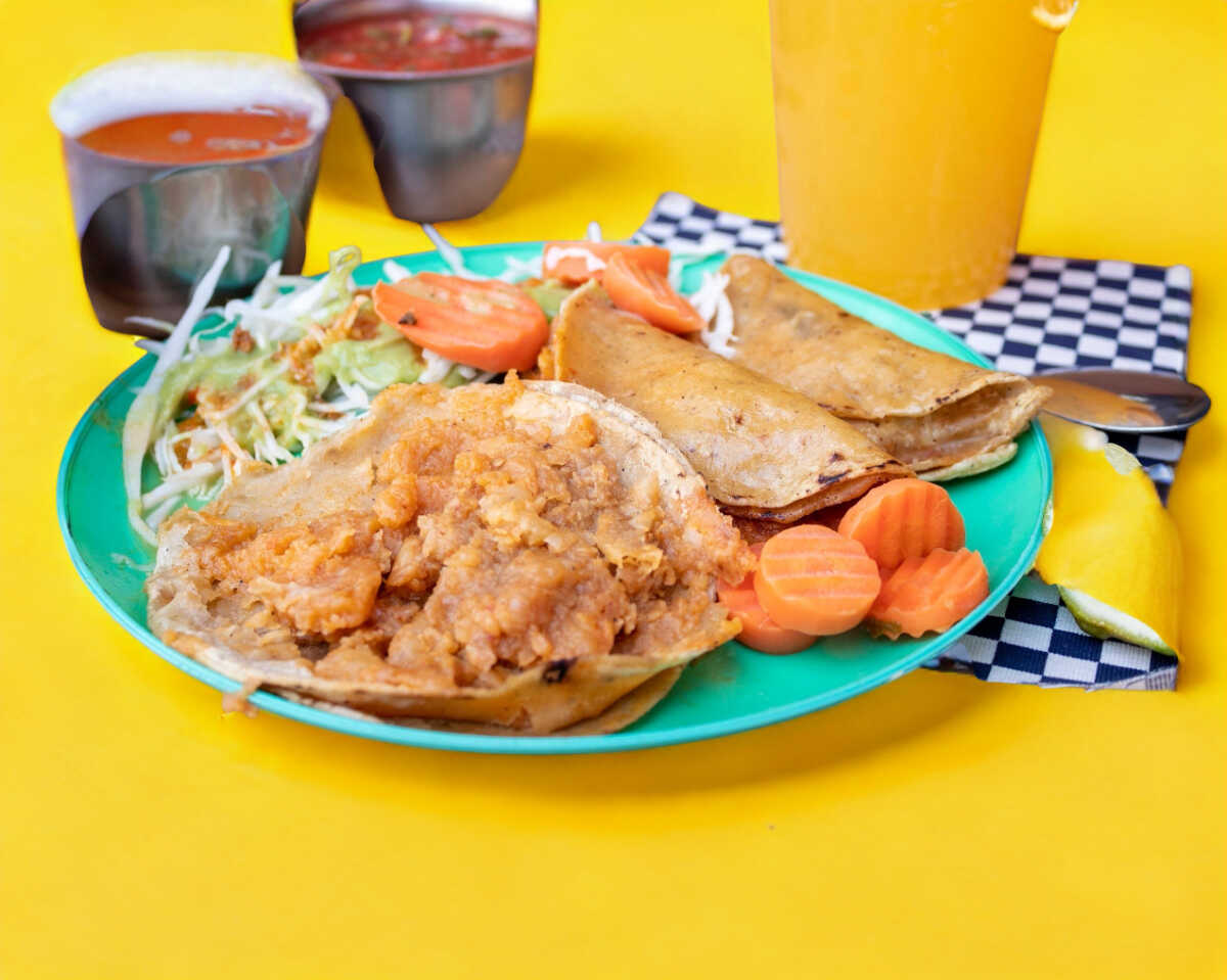 Tortilla de maíz doble, guiso de frijoles, salsa roja, salsa verde, salsa de aguacate, zanahorias, col y salsa mexicana.