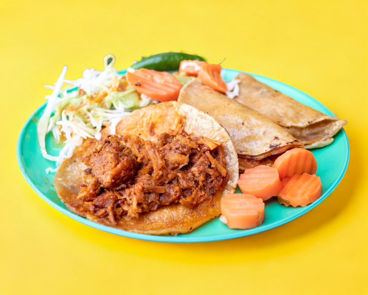 Tortilla doble, carne deshebrada de puerco, con guarniciones (salsas de jitomate, salsas de tomate enchiloso, zanahorias y guacamole)