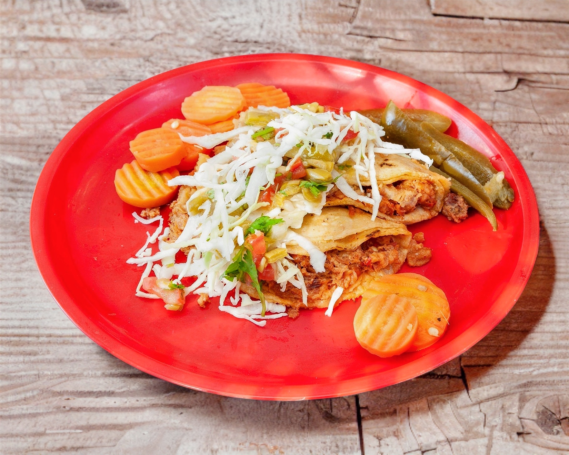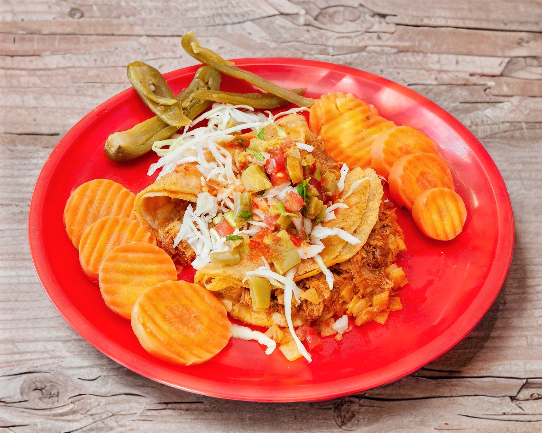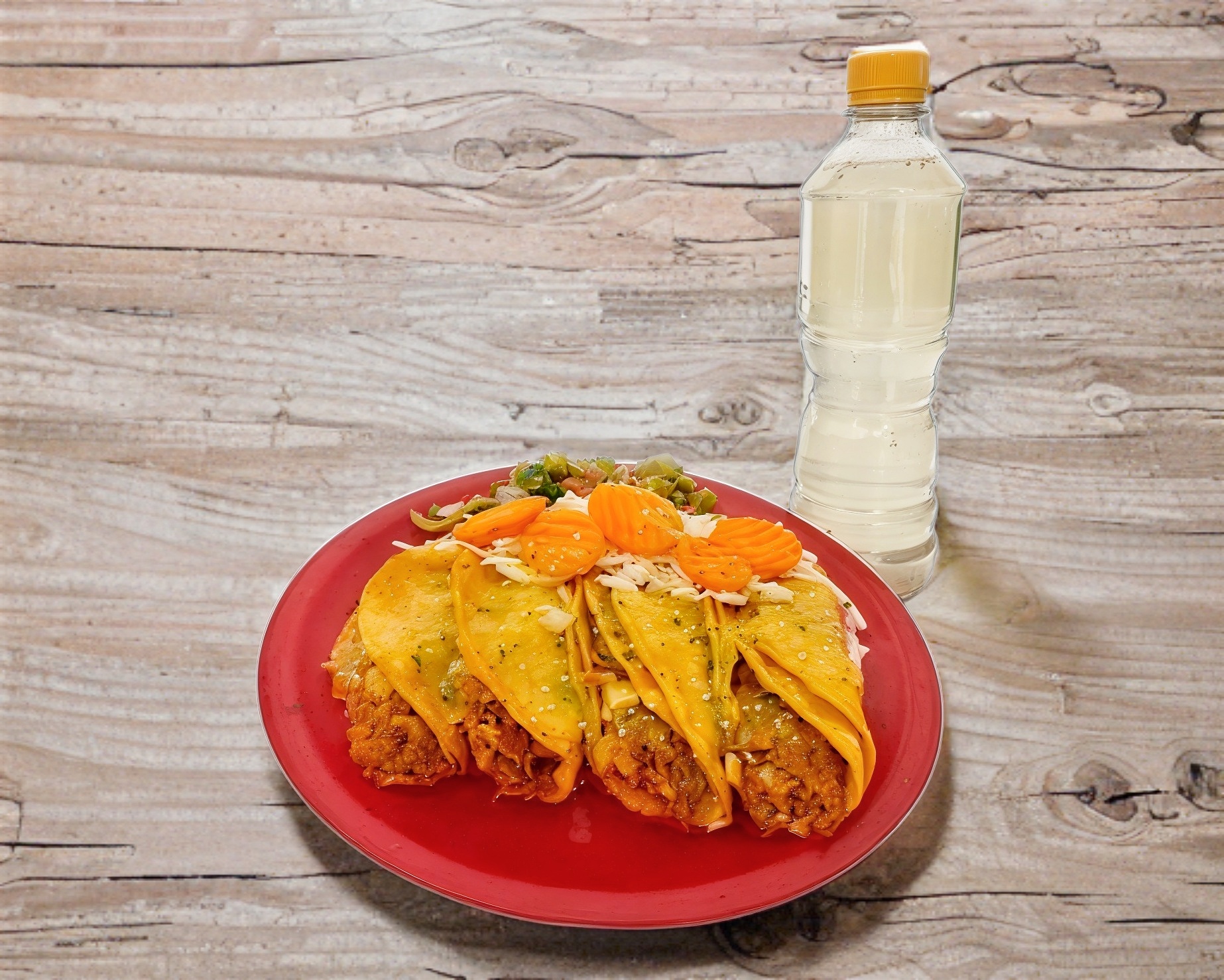 Incluye 2 tacos de deshebrada y 2 tacos de chicharrón