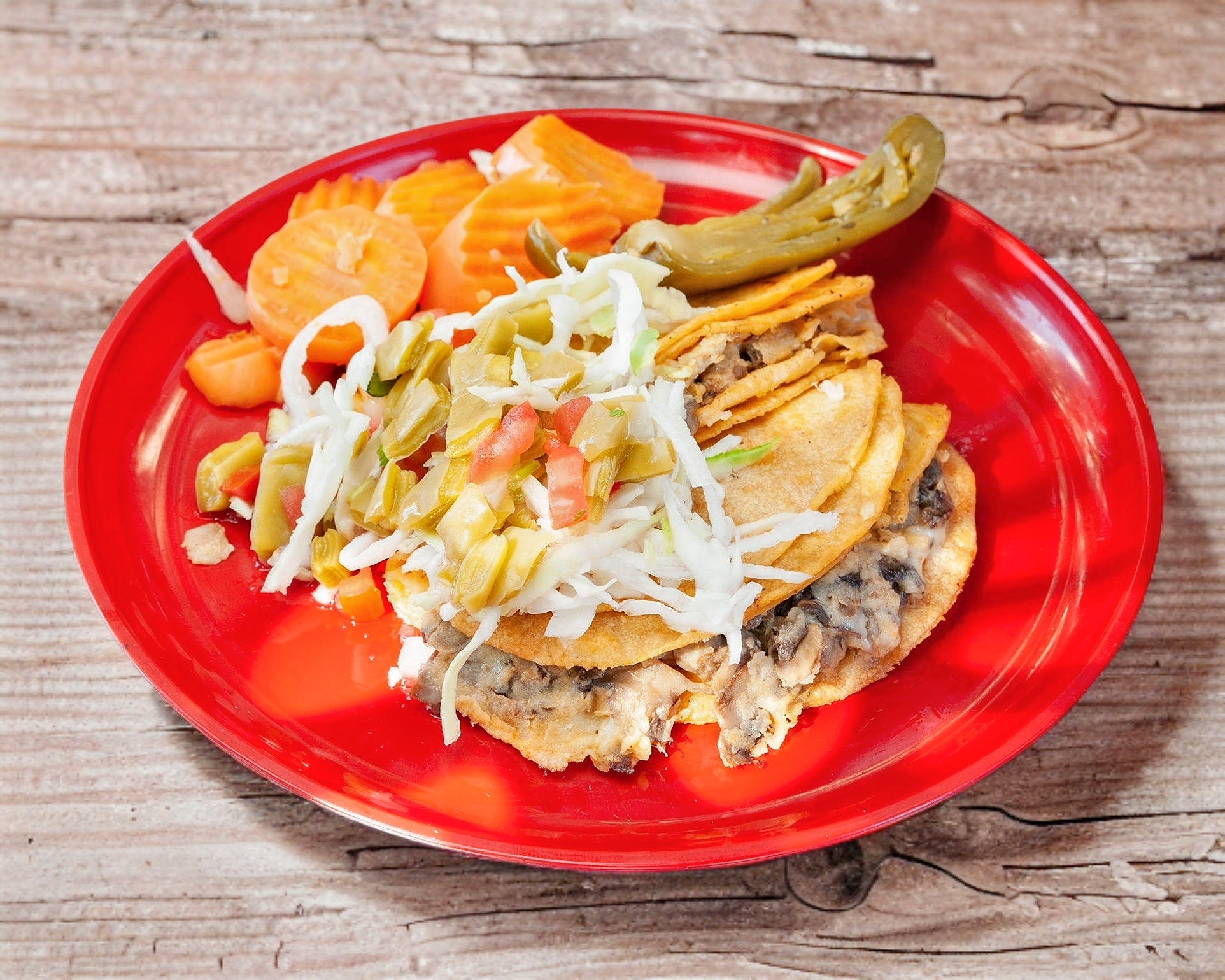 Champiñones cocidos acompañados de queso derretido, creando un taco ligero, jugoso y lleno de sabor envueltos en doble tortilla. ideal para los amantes de lo natural.