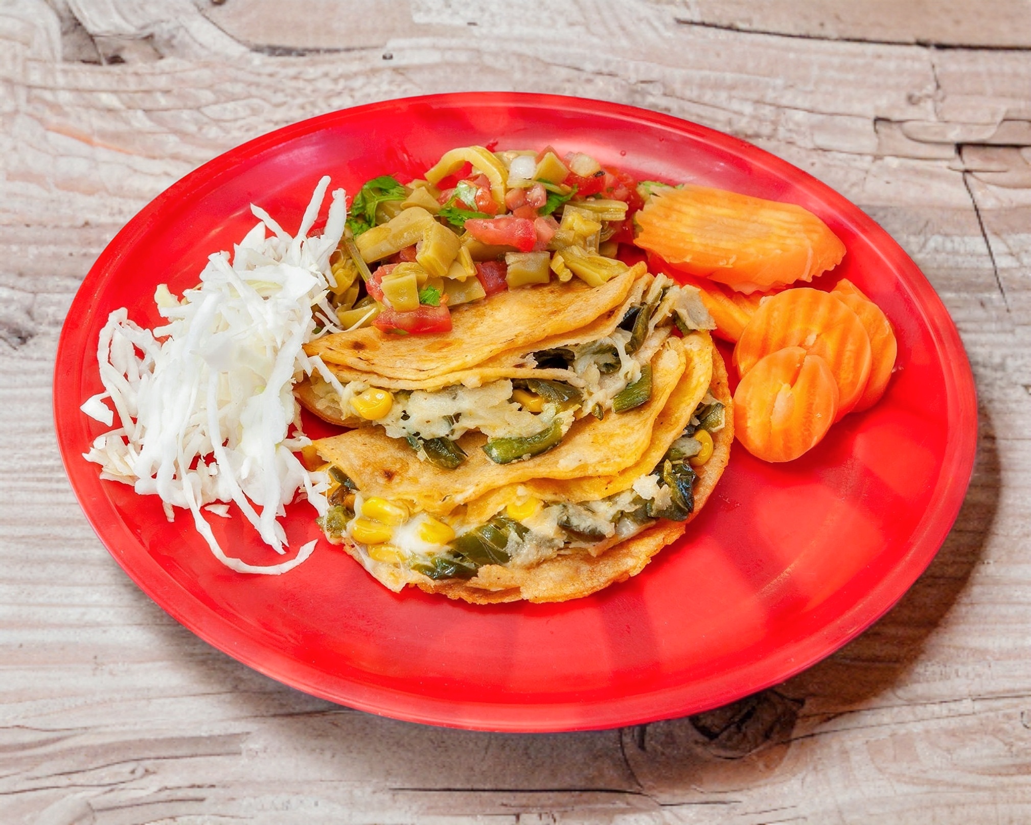 Rajas de chile poblano guisadas, picadas y mezcladas con granos de elote y queso fundido, todo envuelto en doble tortilla. una combinación cremosa y sabrosa.