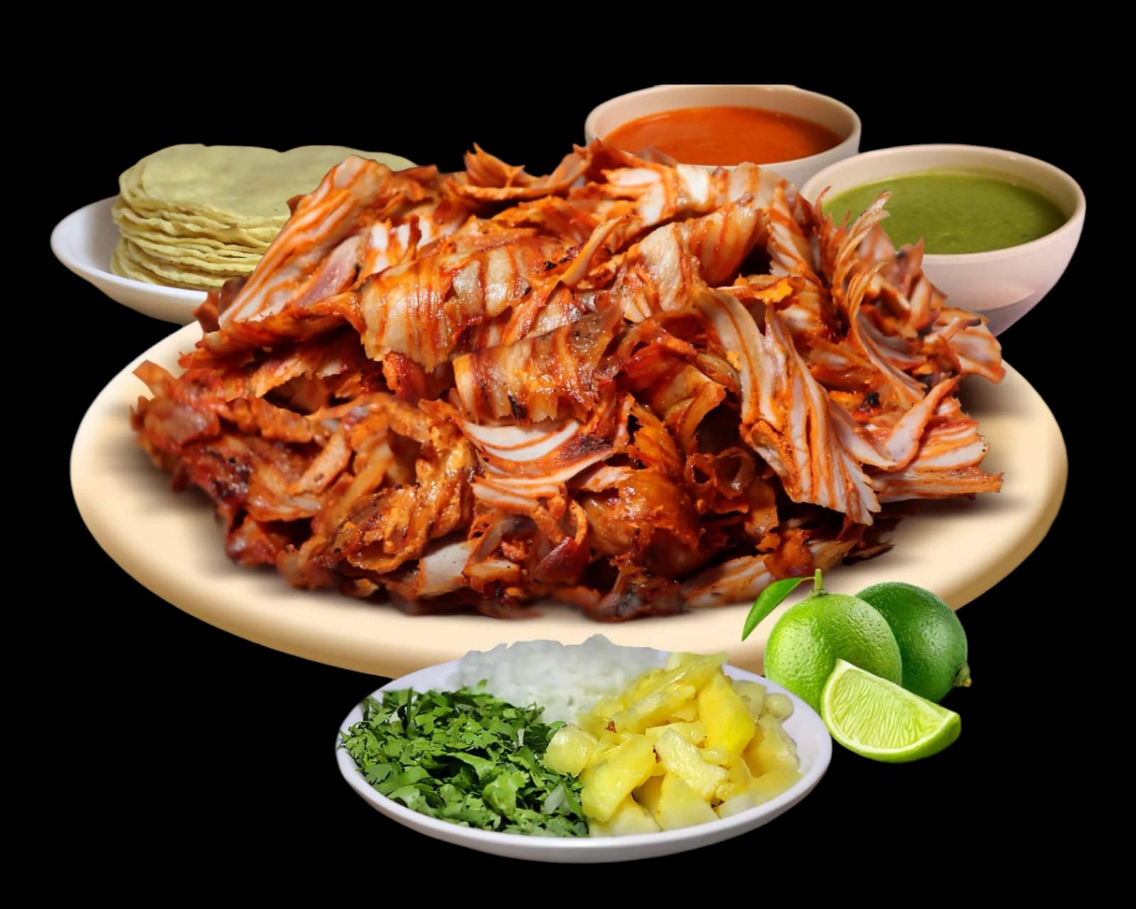 Carne mixta (250 g), tortillas de maíz, cebolla, cilantro y piña.