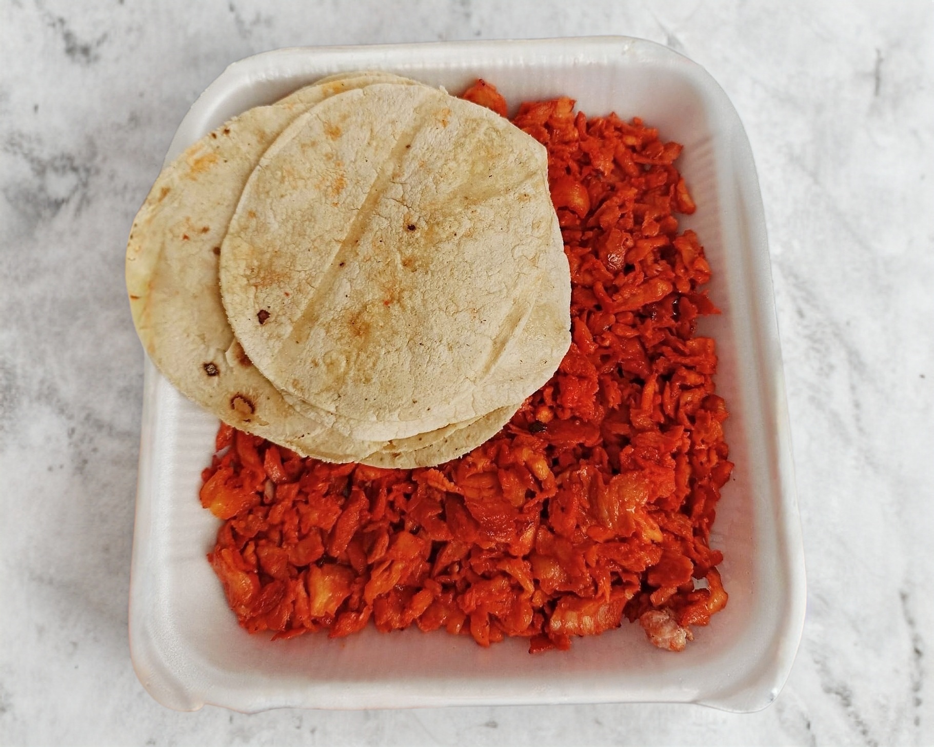 Carne al pastor (250 g), tortillas de maíz, cebolla, cilantro y piña.